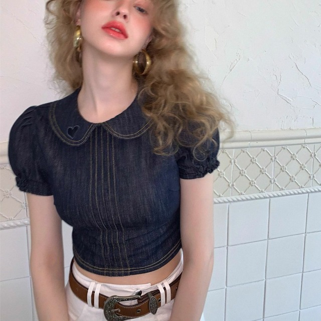 uena パフスリーブ デニム ブラウス 半袖 丸襟 ショート丈 刺繍