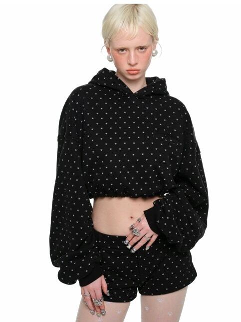 ドットのようにも見える、猫の足跡柄とねこ耳がついたフードが可愛いスウェット。オーバーなサイズ感ながらショート丈ですっきり着用できます◎