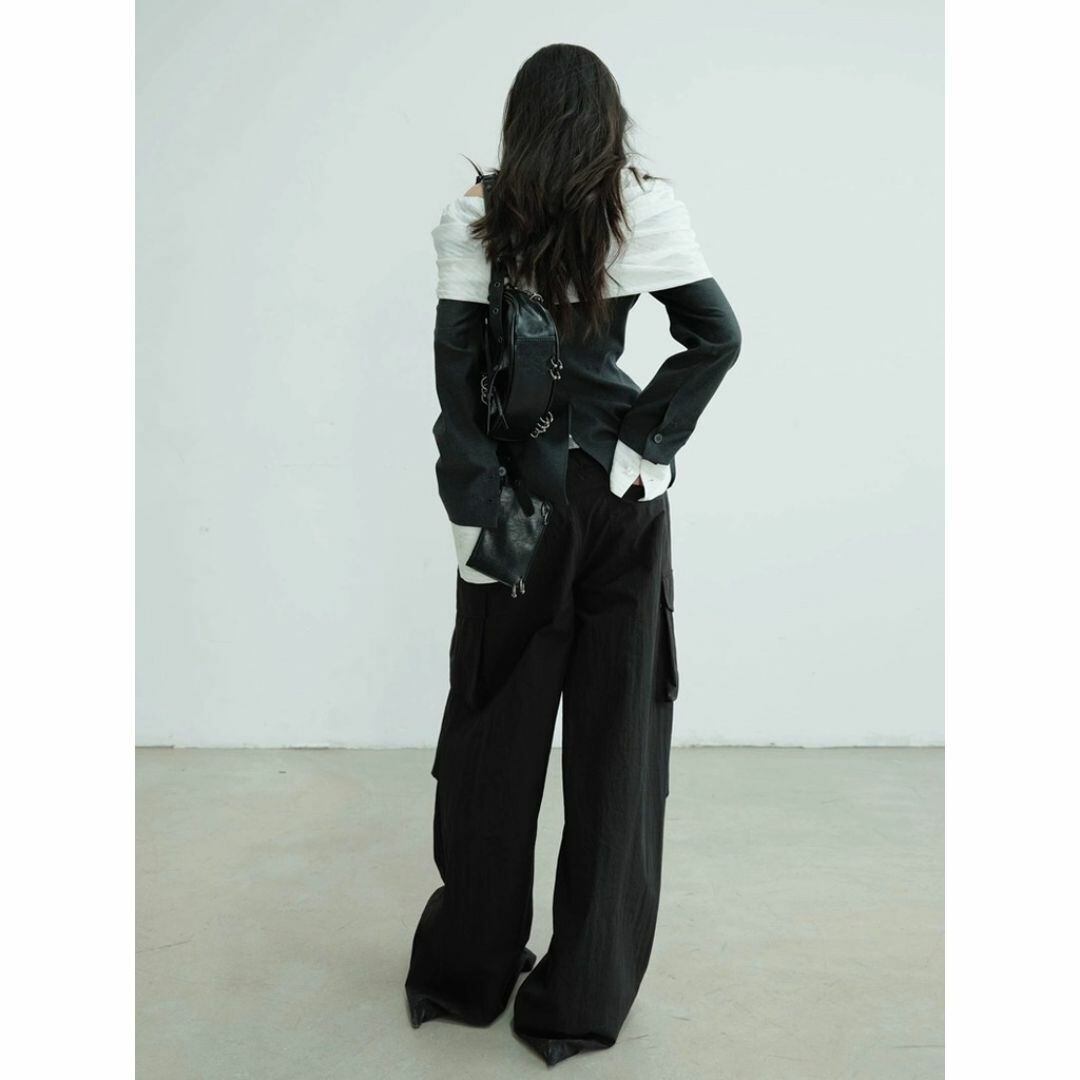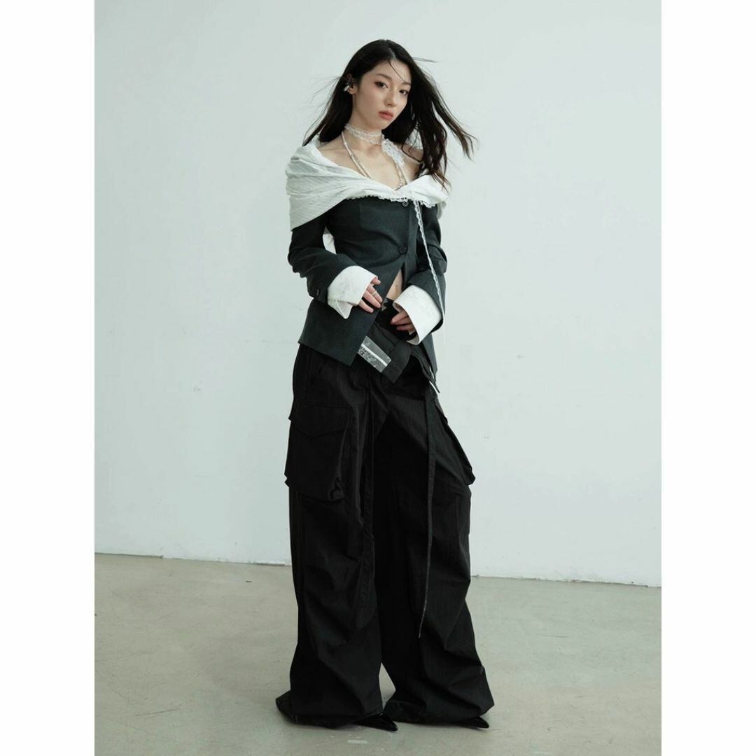 オフショルダーにウエストシェイプされたシルエットが女性らしさもあるモードなジャケットです。