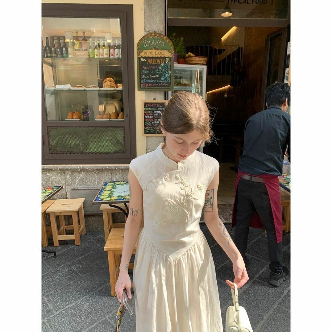 刺繍やチャイナカラーがオリエンタルな雰囲気なロングワンピース。