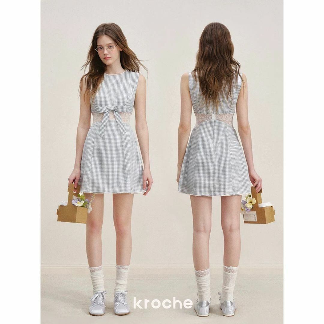 Kroche レース リボン ギンガムチェック ミニワンピース コットン