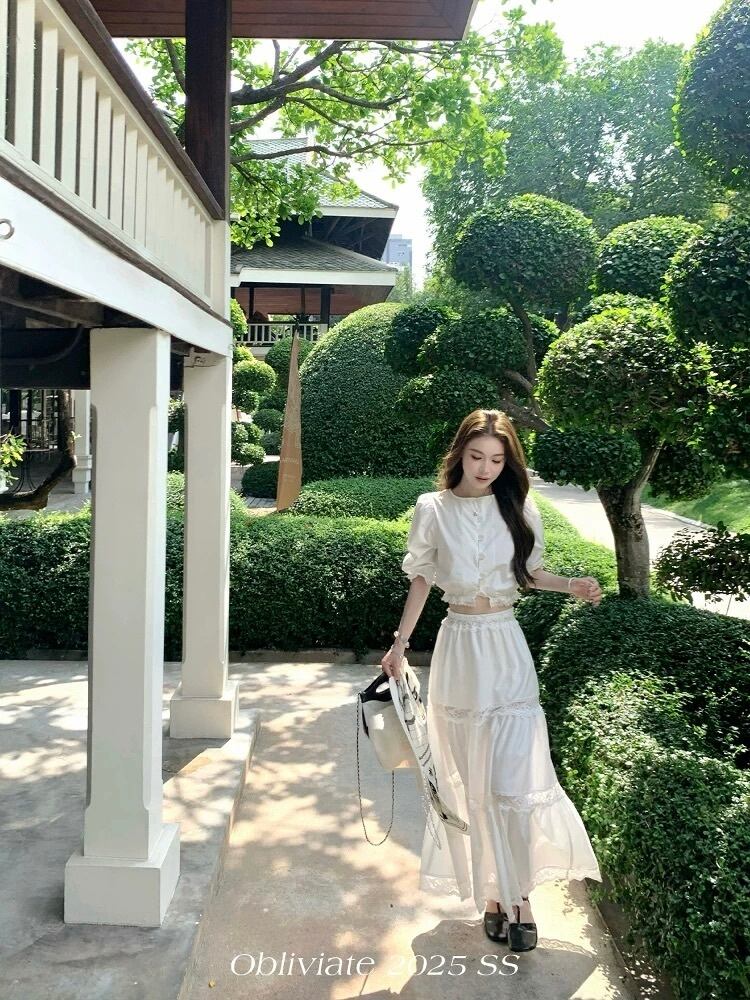 Obliviate ホワイト パフスリーブ ショート丈ブラウス レース コットン