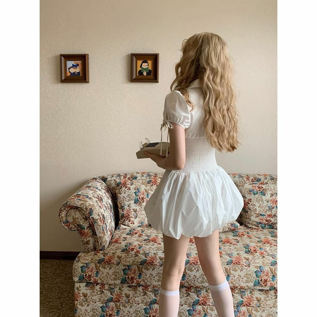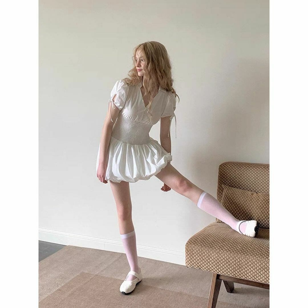 uena ホワイト バルーン ミニワンピース パフスリーブ リボン Vネック