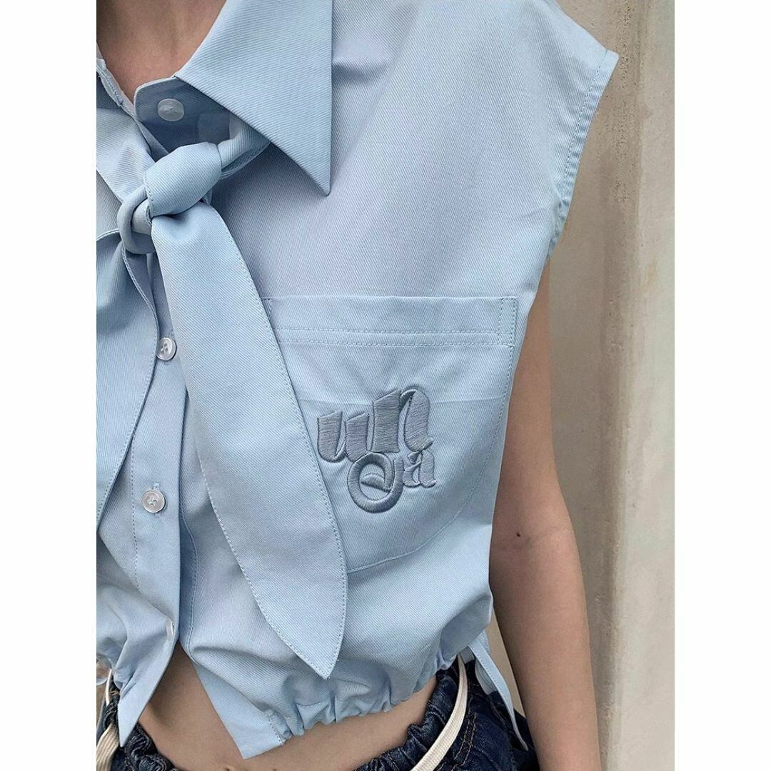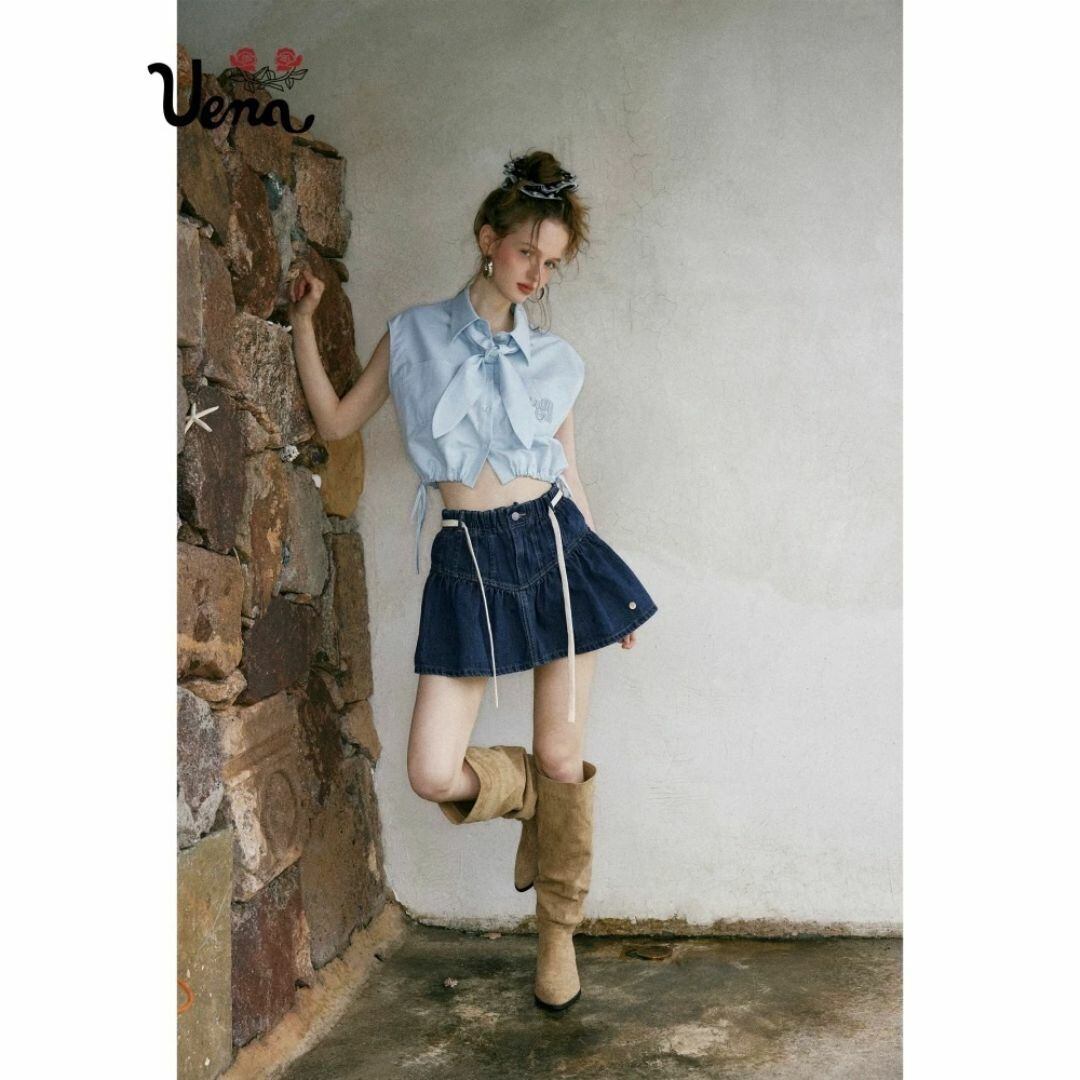 uena リボンタイ ノースリーブ トップス ショート丈 ドロスト ブルー