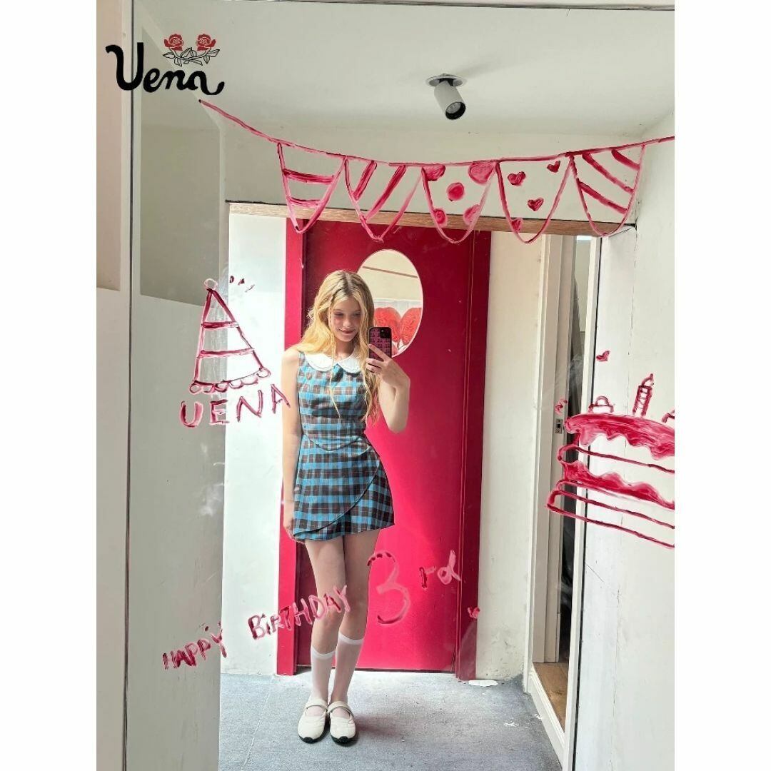 uena チェック柄 アシンメトリー ミニワンピース 丸襟 ブルー ノースリーブ