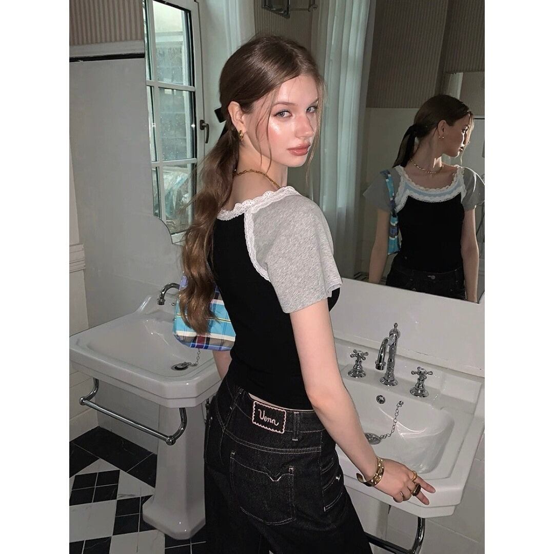 Uena レイヤード Tシャツ レース フレア コンパクト ショート丈 ブラック