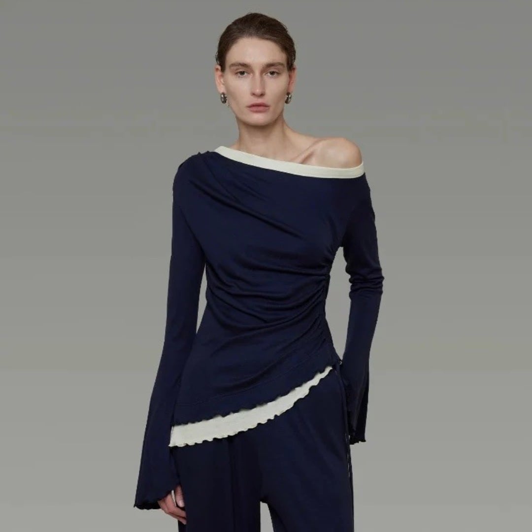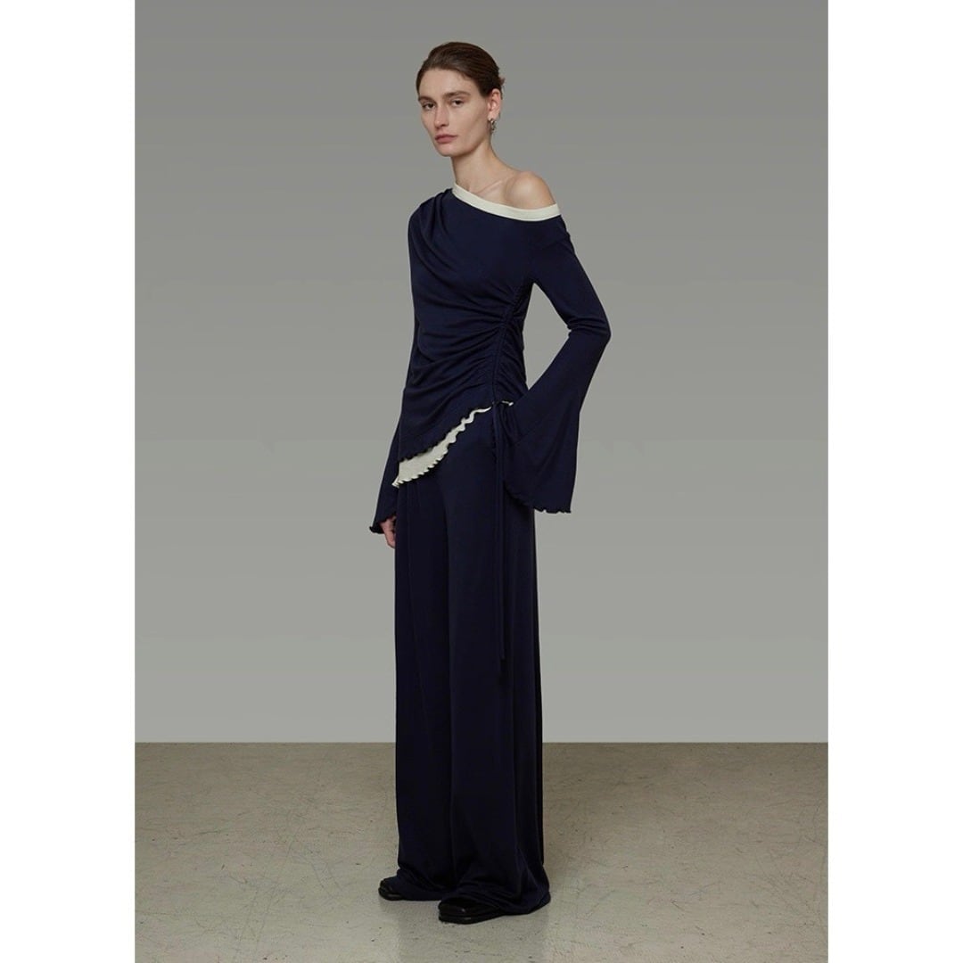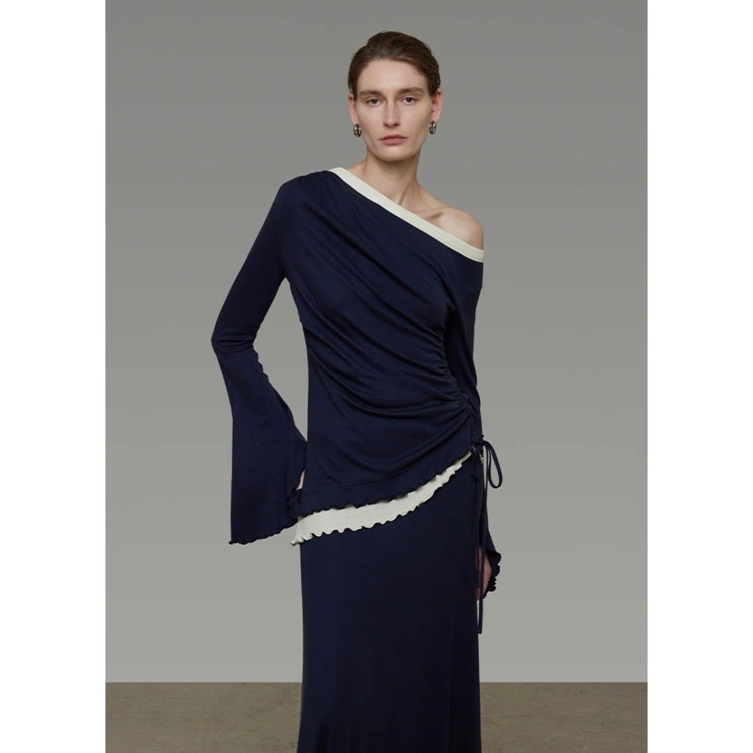 unspoken オフショルダー ベルスリーブ ニット ネイビー フレア フリル