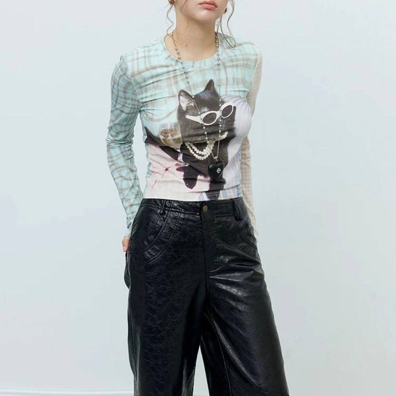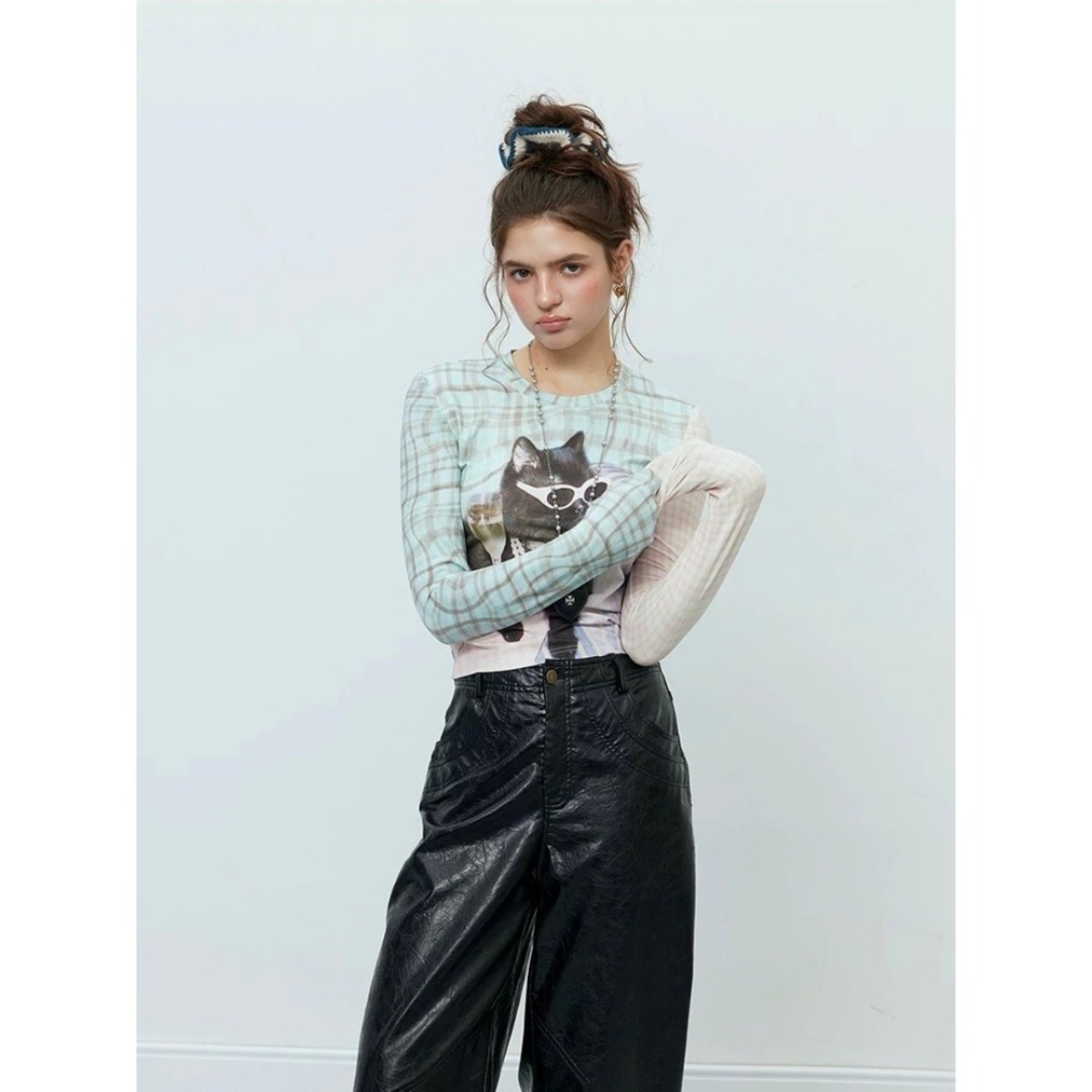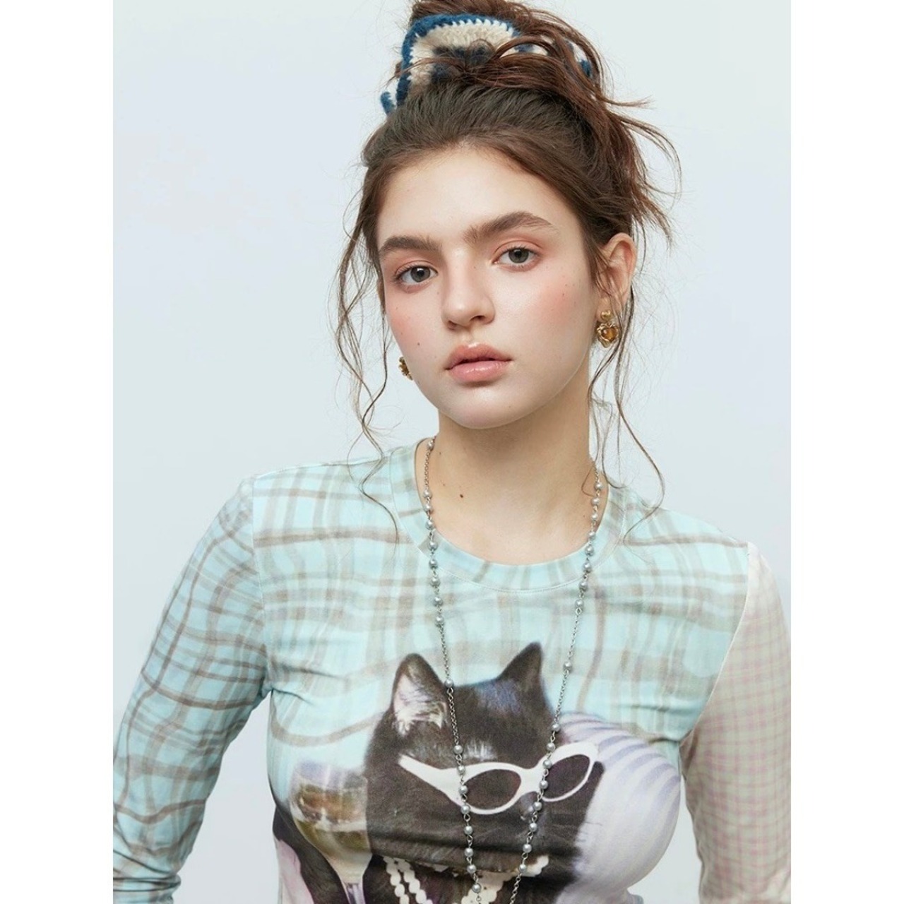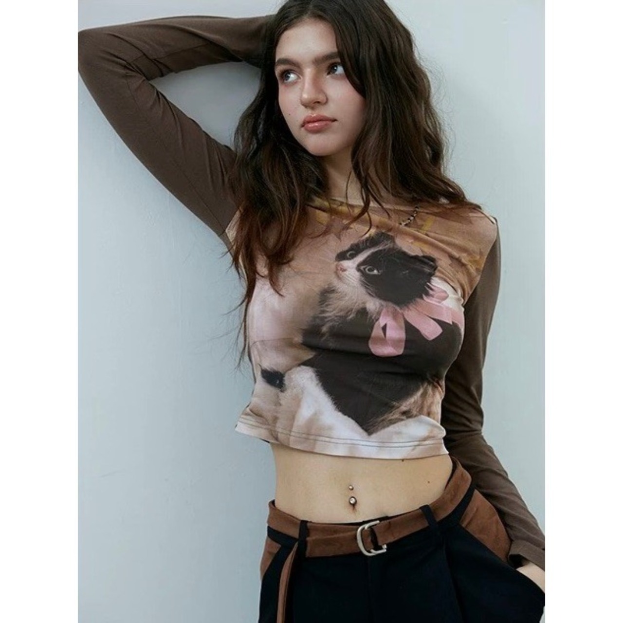 uena 猫柄 ストレッチ カットソー トップス コンパクト ショート丈