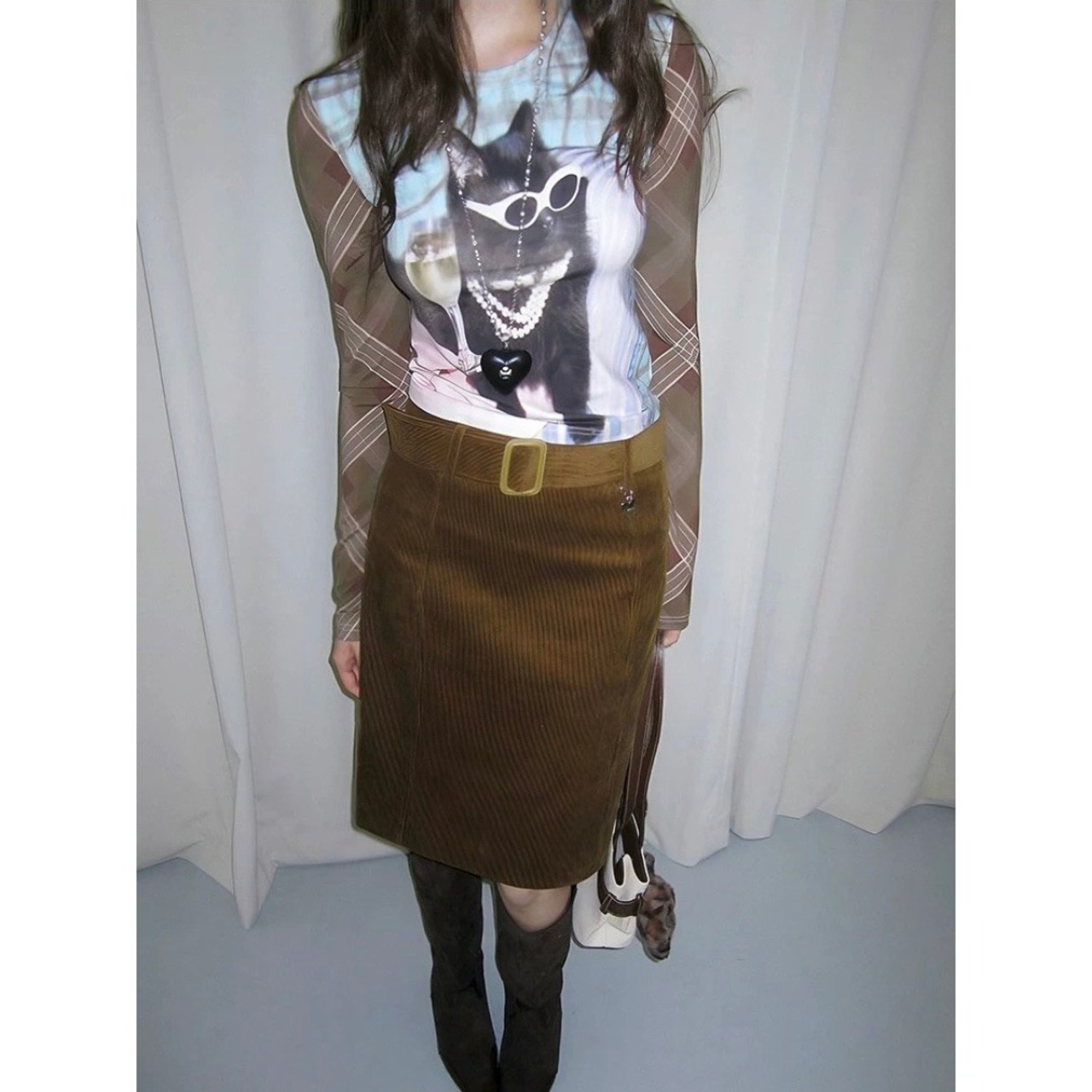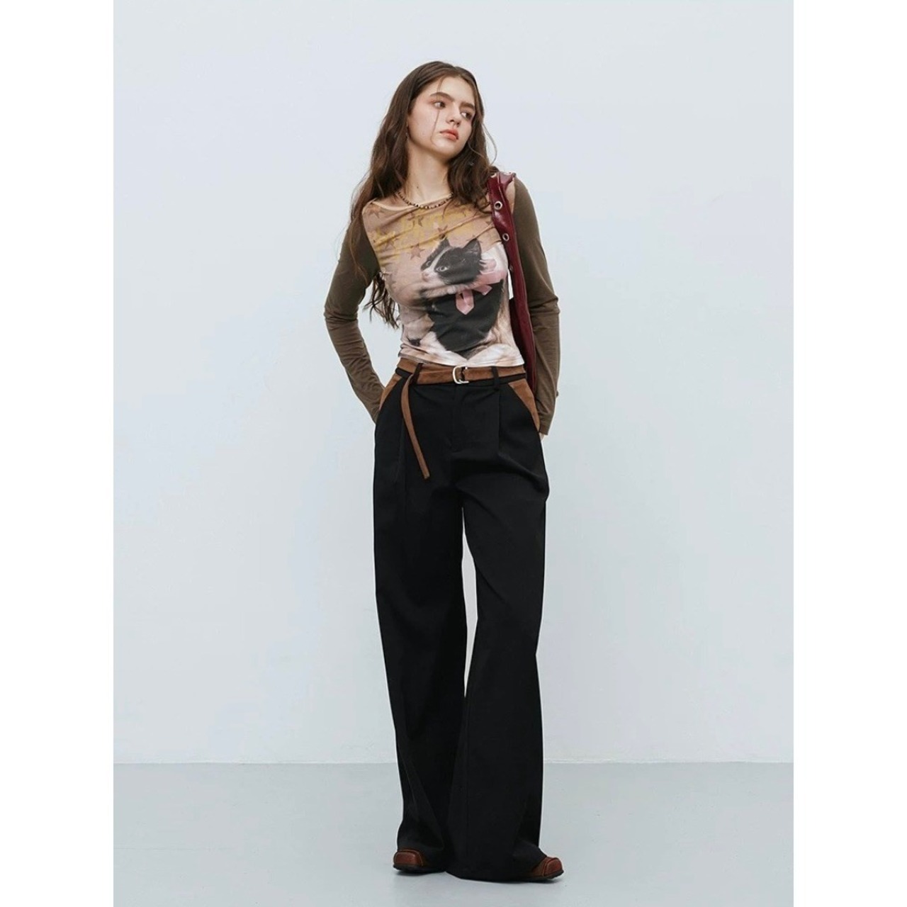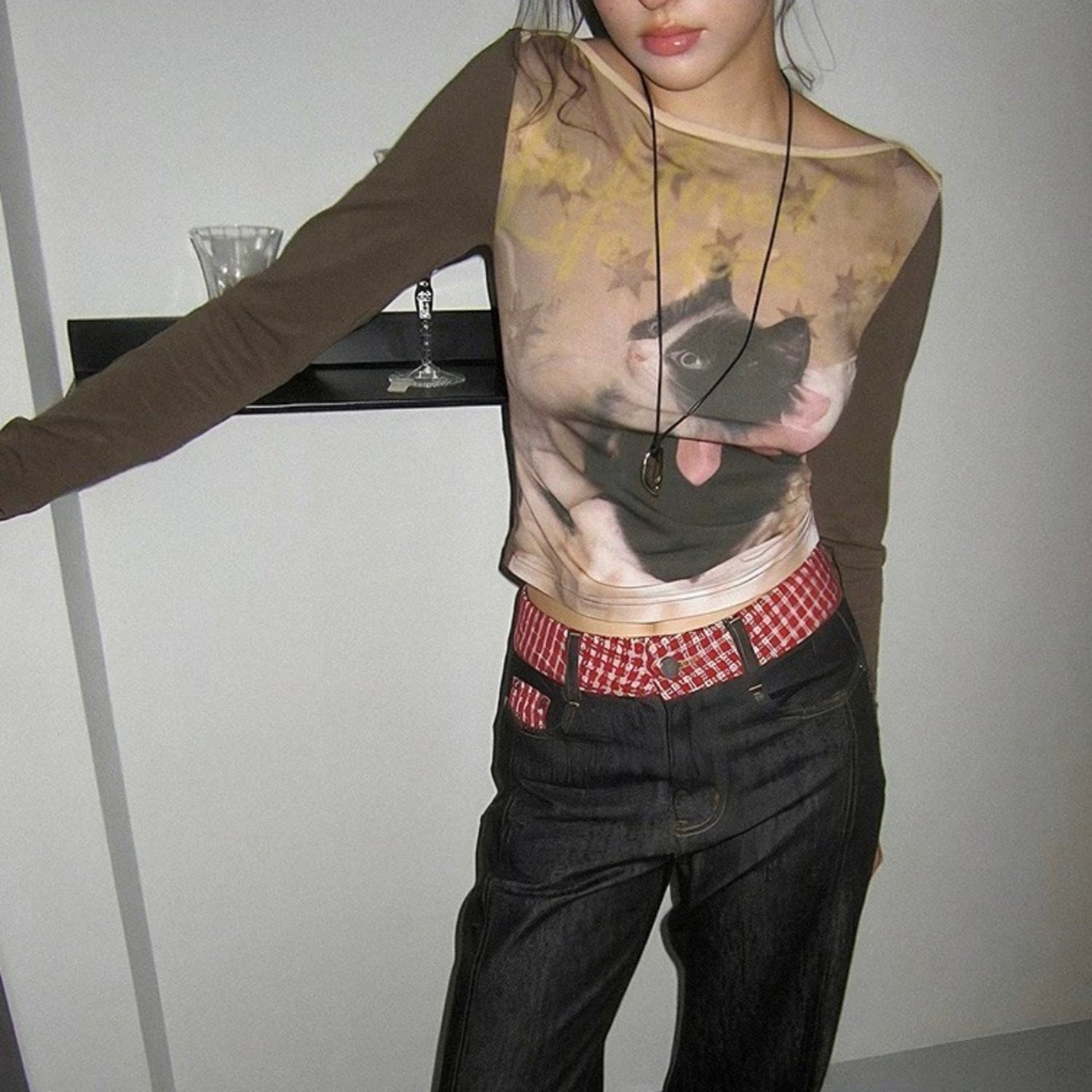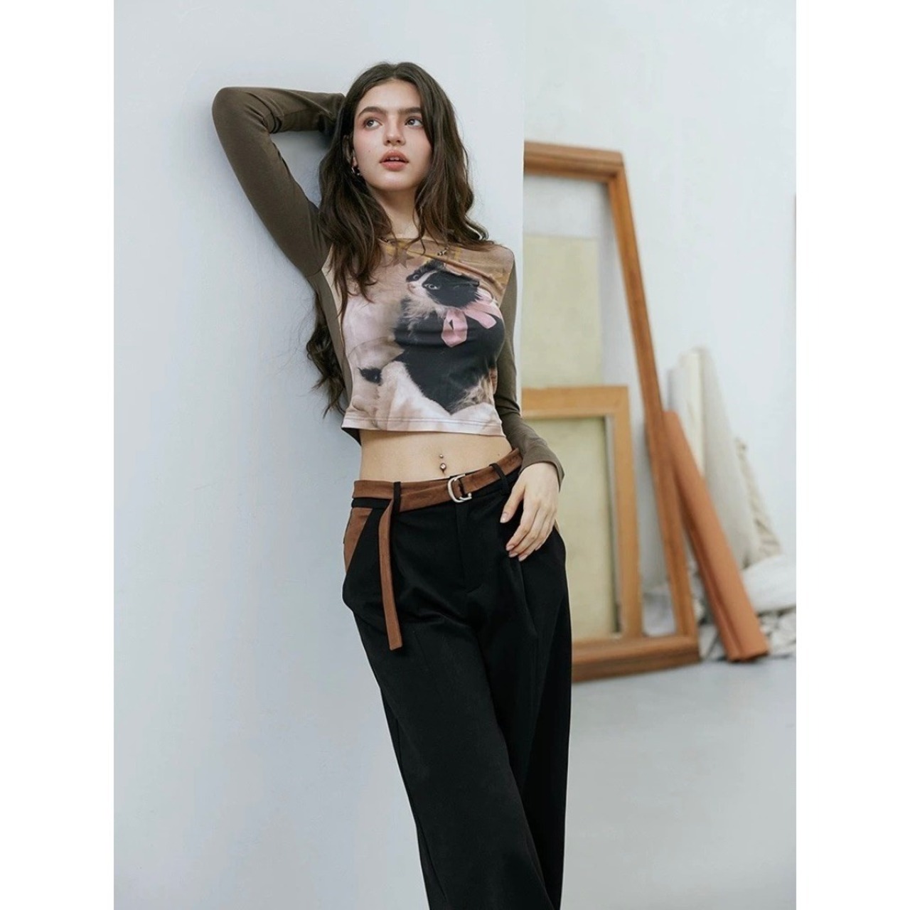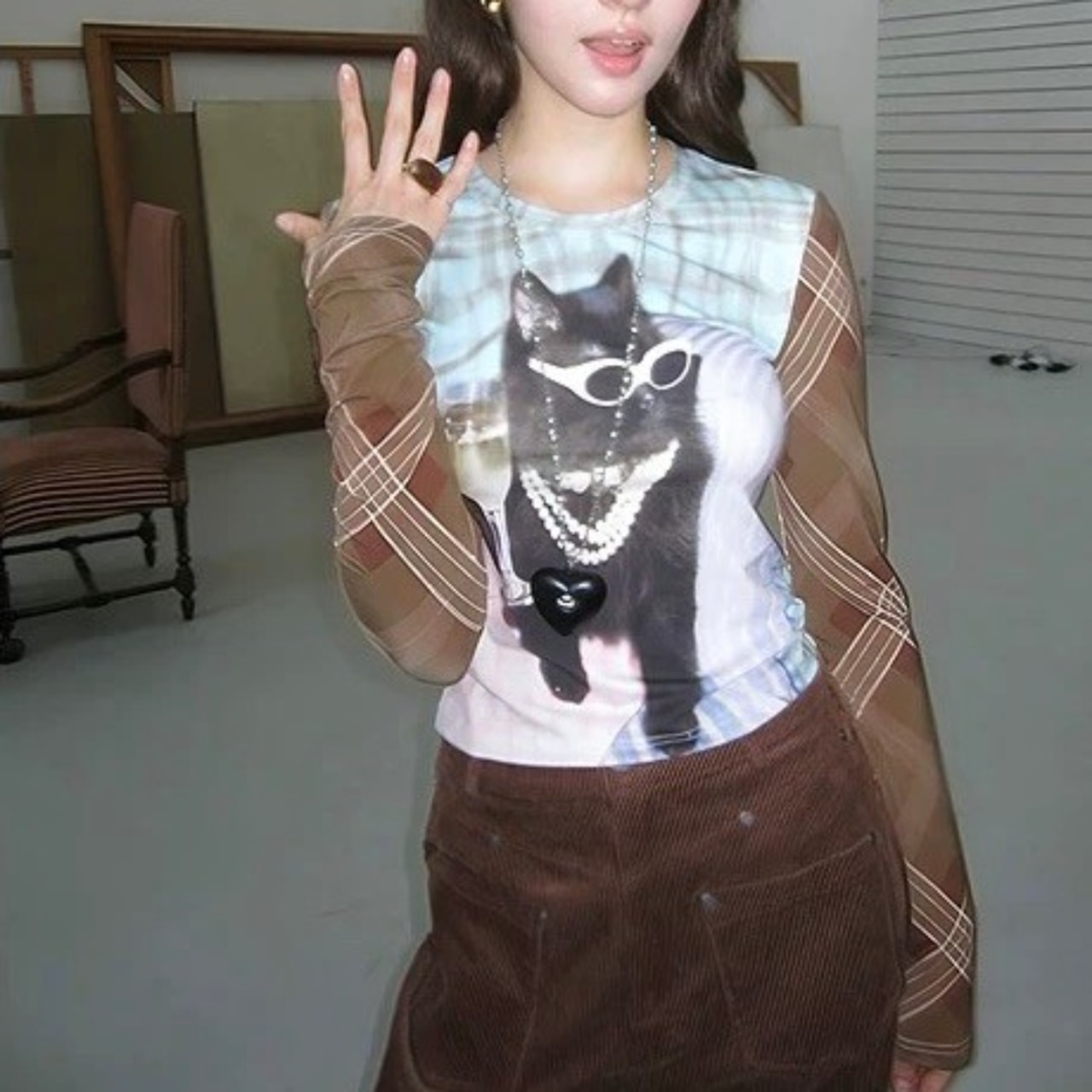 uena 猫柄 ストレッチ カットソー トップス コンパクト ショート丈