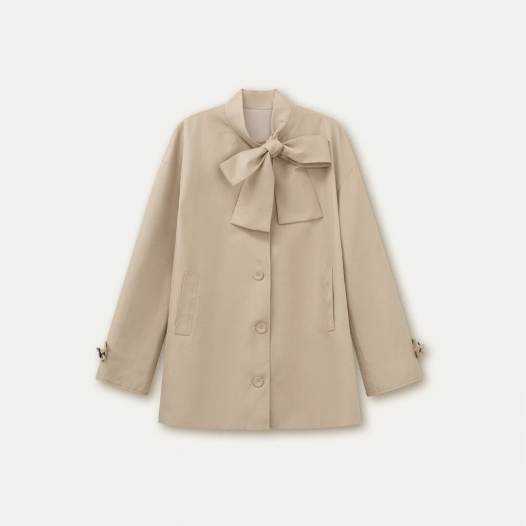大きなリボンタイと控えめなフレアシルエットが大人ガーリーなコート。パンツでもスカートでも合わせやすい丈感です◎