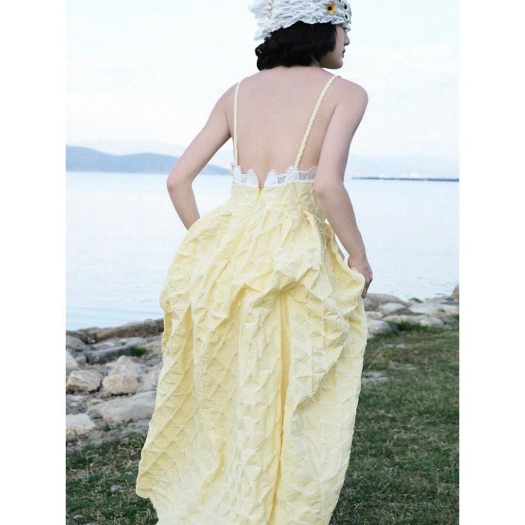 ■Design:立体感のあるシルエットと明るいイエローが可愛いロングドレス。