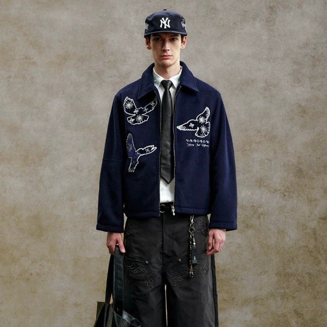 YADcrew 鳥刺繍 スパンコール ショートジャケット ネイビー Y2K