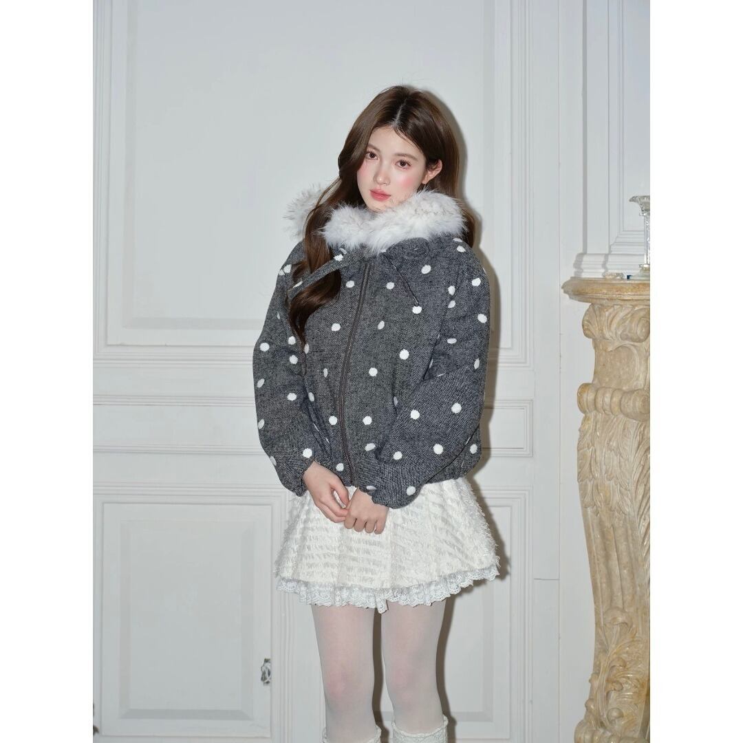 ■Design:リボン ホワイトファー襟 ポルカドット ショート丈