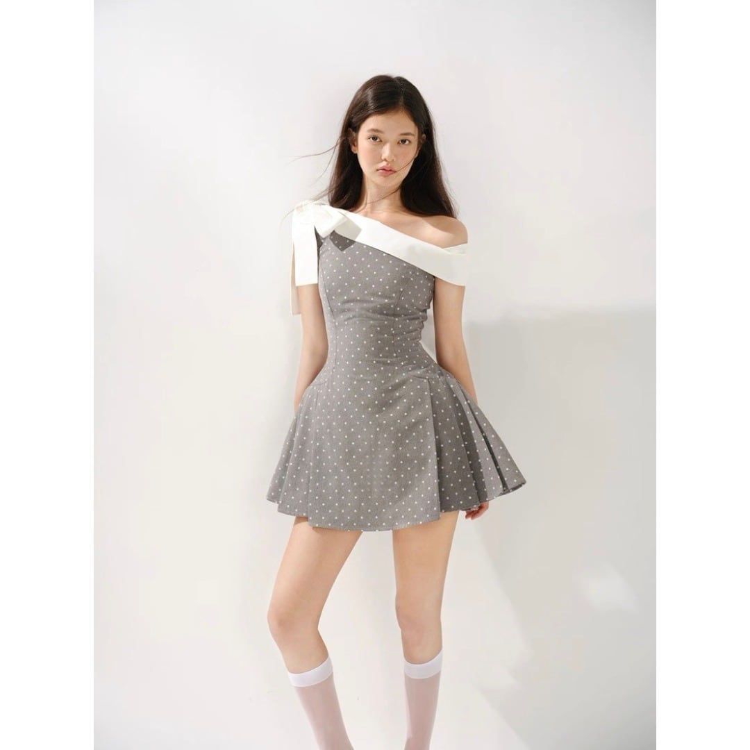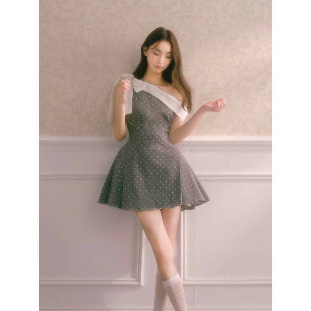 RECIT オフショルダー リボン ドット柄 ミニワンピース グレー フレア