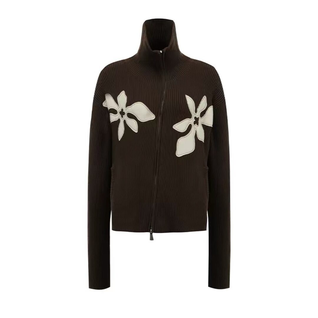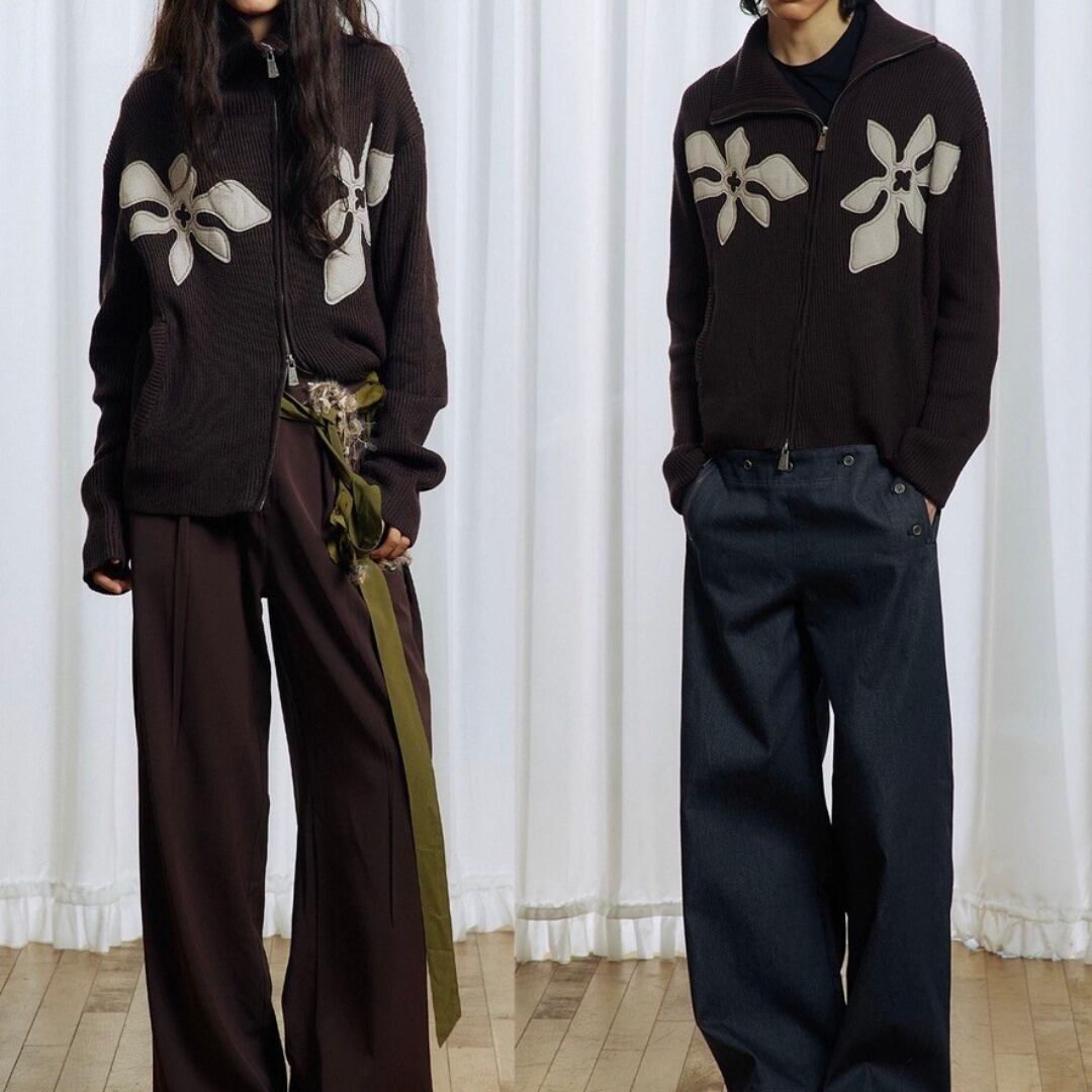 ■Design:ユニセックス フラワー ハイネック ジッパー セーター カーディガン