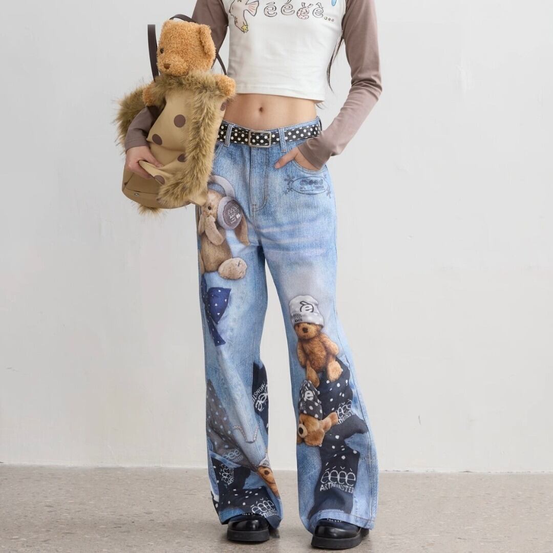 eeee.artmonster ユニセックス プリント ぬいぐるみ ワイドデニム