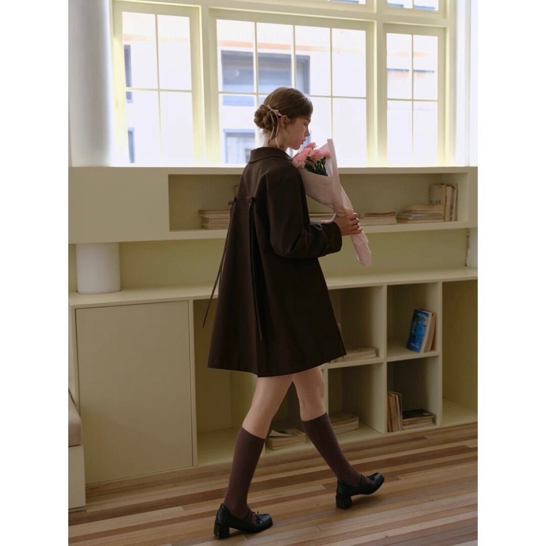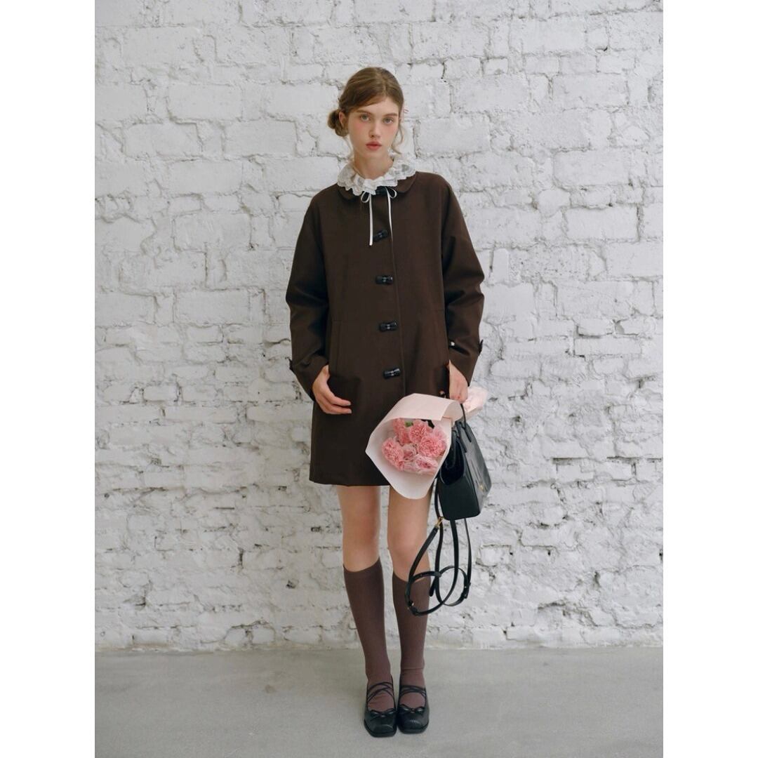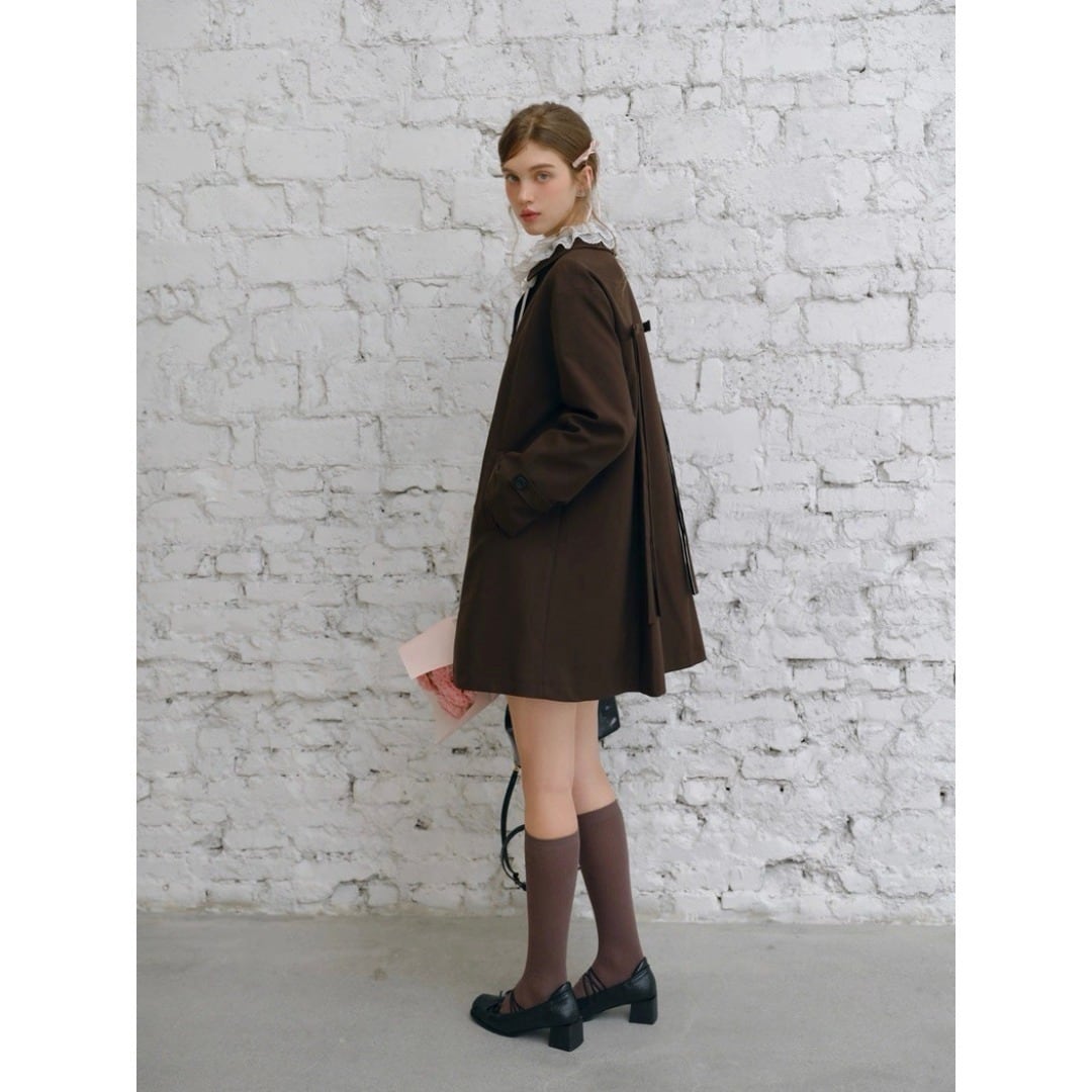 ■Design:フレンチ Aライン フレア ステンカラー 丸襟 コート リボン ブラウン