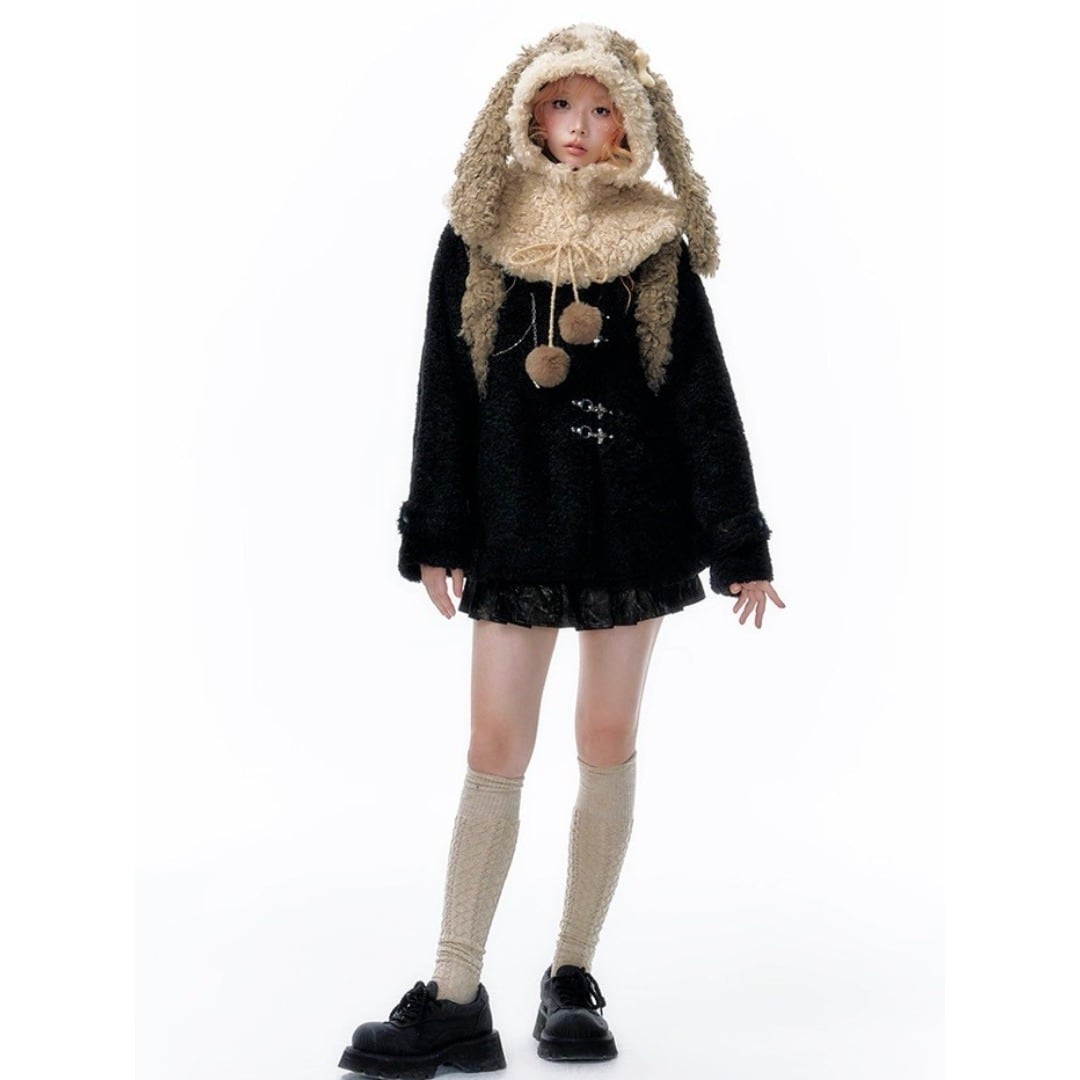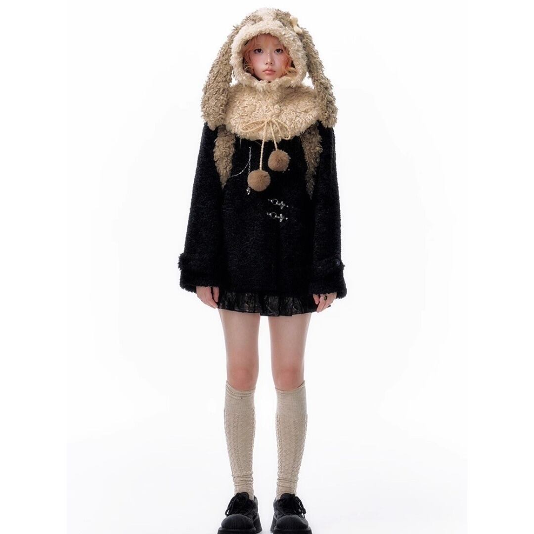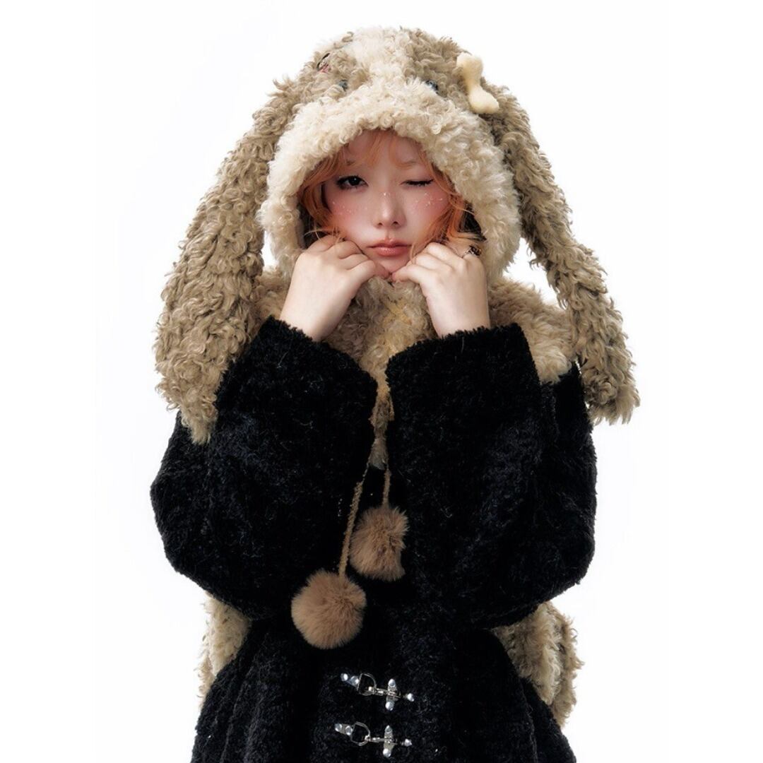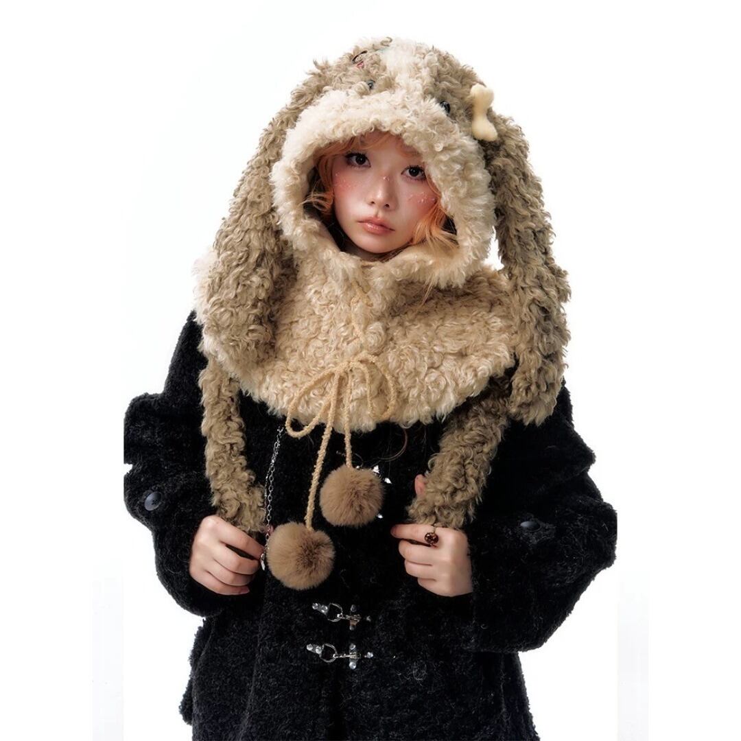 YangErdaMeng うさぎ シャギーニット 帽子 ケープ ブラウン Y2K