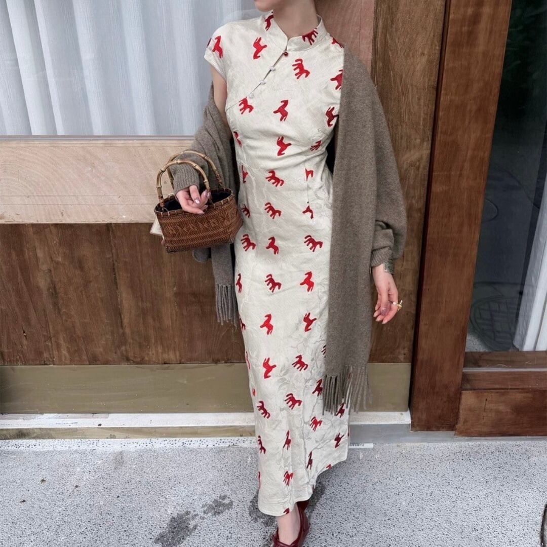 ■Design:干支 馬柄 ジャガード チャイナワンピース ロング ドレス