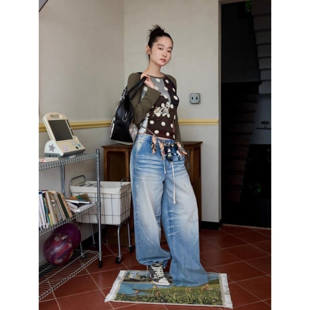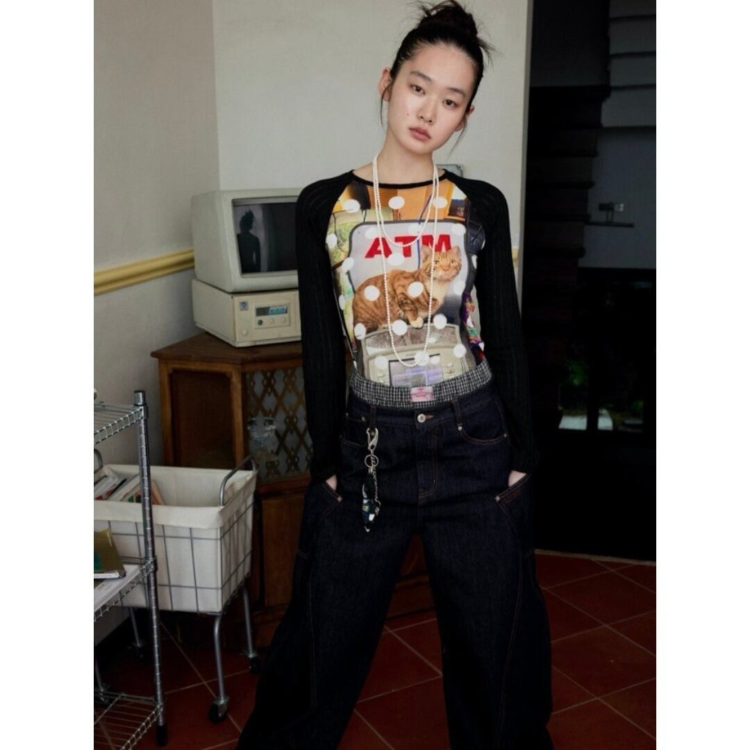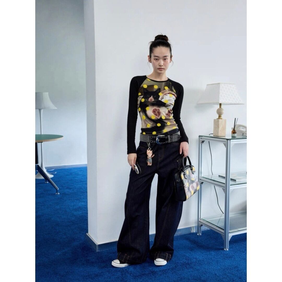 1JINNSTUDIO ドック キャット プリント ドット柄 ラグランカットソー