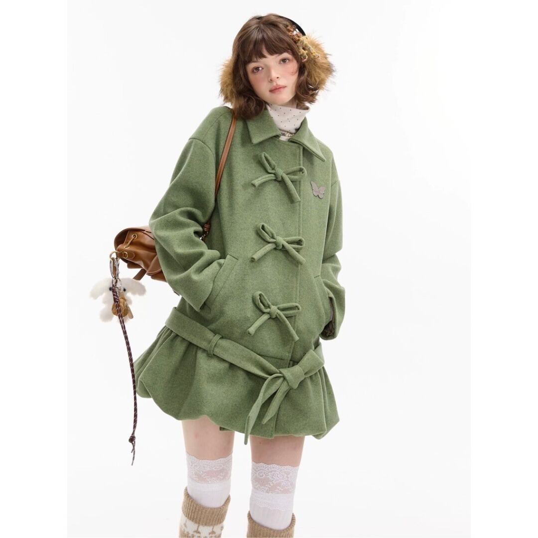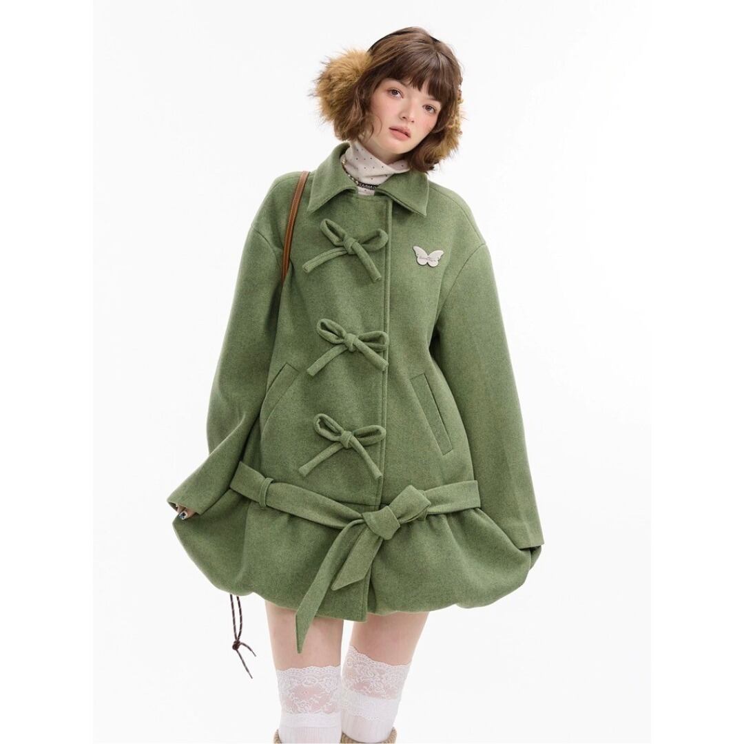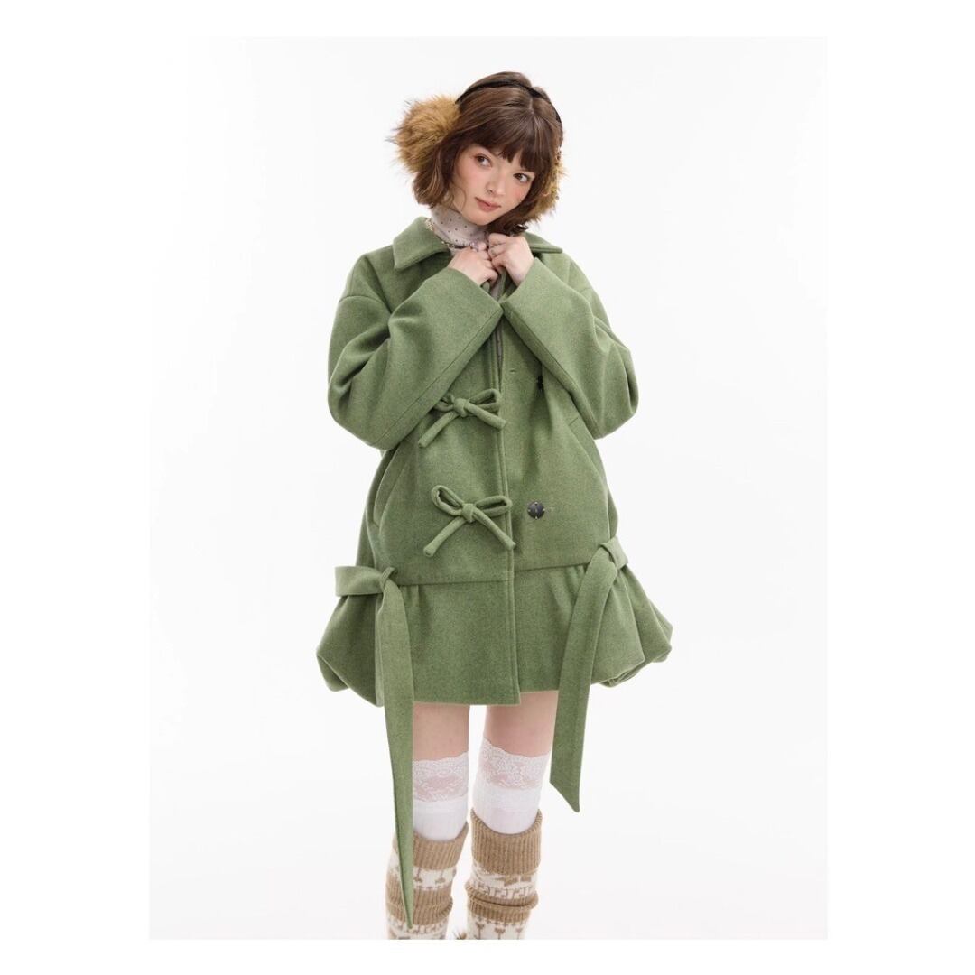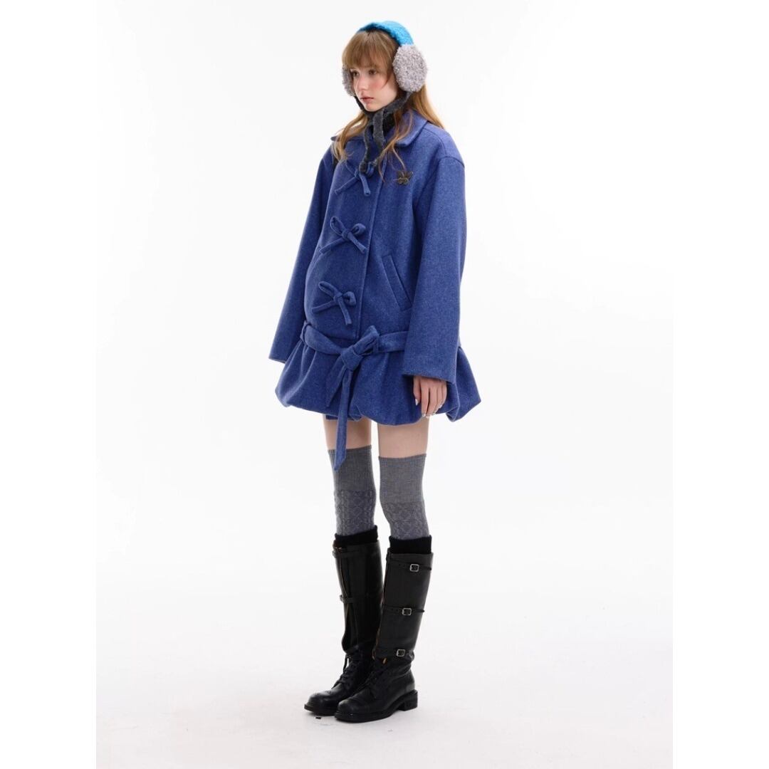 ■Design:リボン バルーンフレア ミディアム ウールコート ローウエスト Y2K