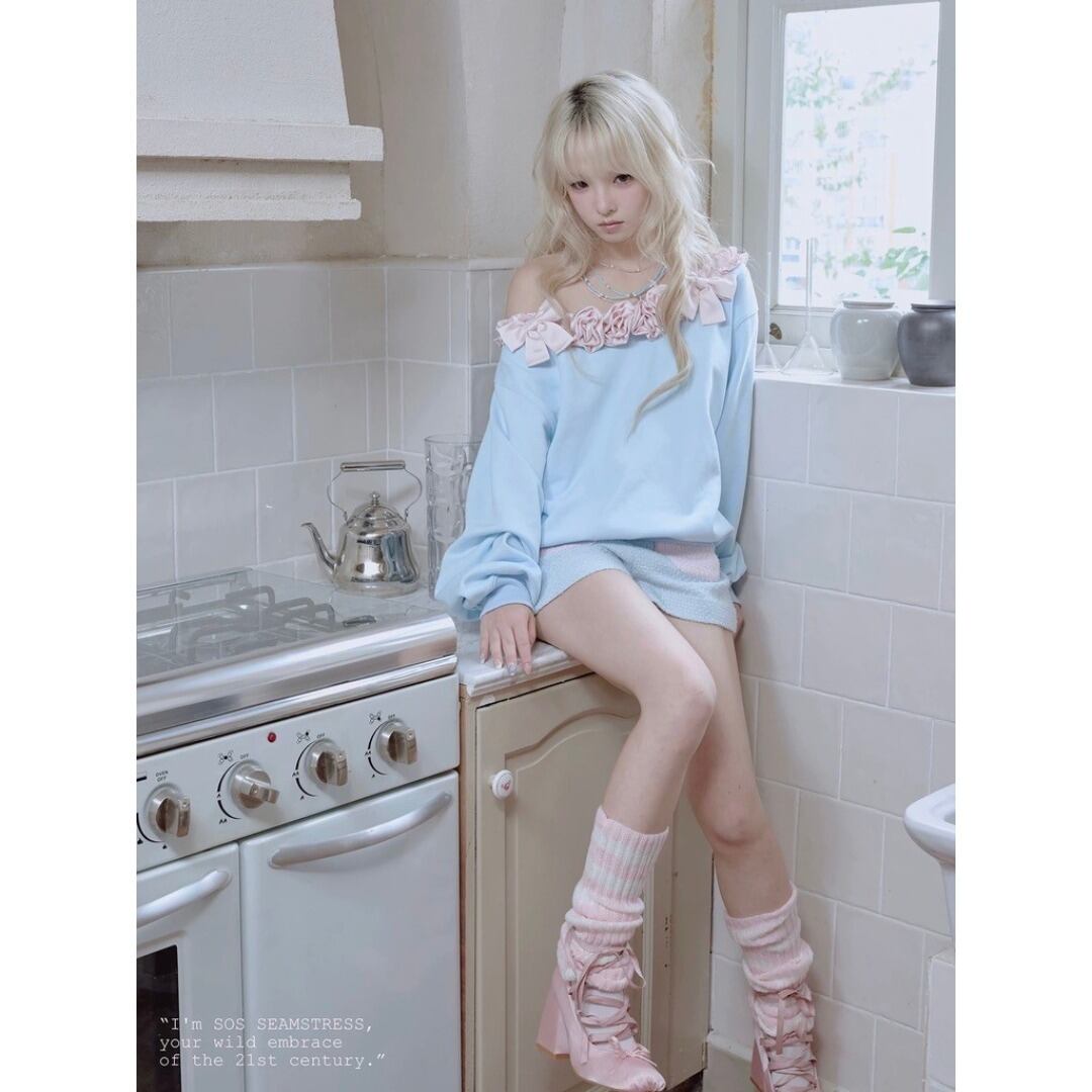 SOS SEAMSTRESS オフショルダーピンクサテンローズ スウェット