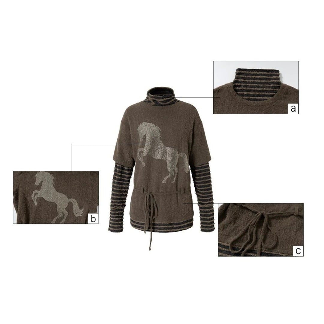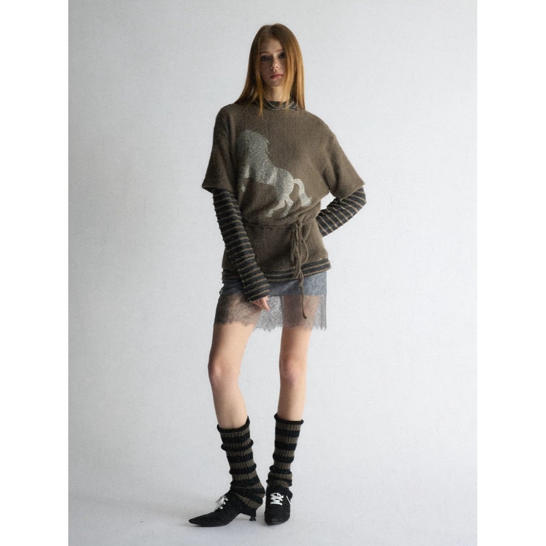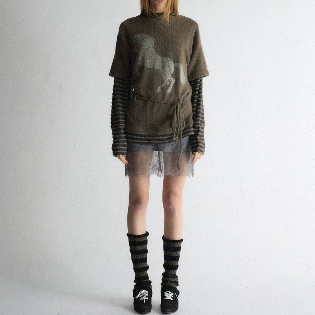 ■Design:ラインストーン ポニー フェイクレイヤード ニット カットソー オーバーサイズ