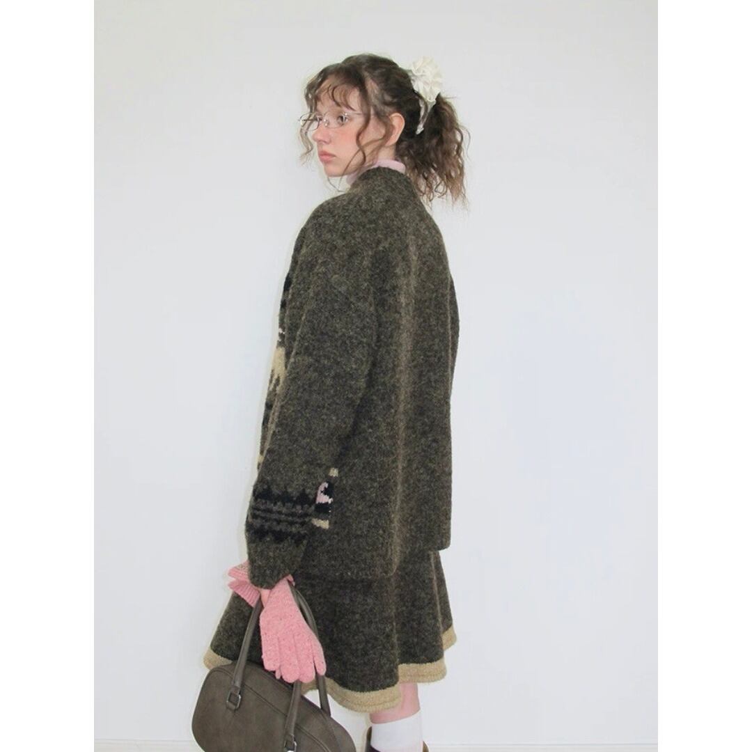 UNSOYAO レトロ フェアアイル ポニー柄 ニットセットアップ カーディガン&スカート