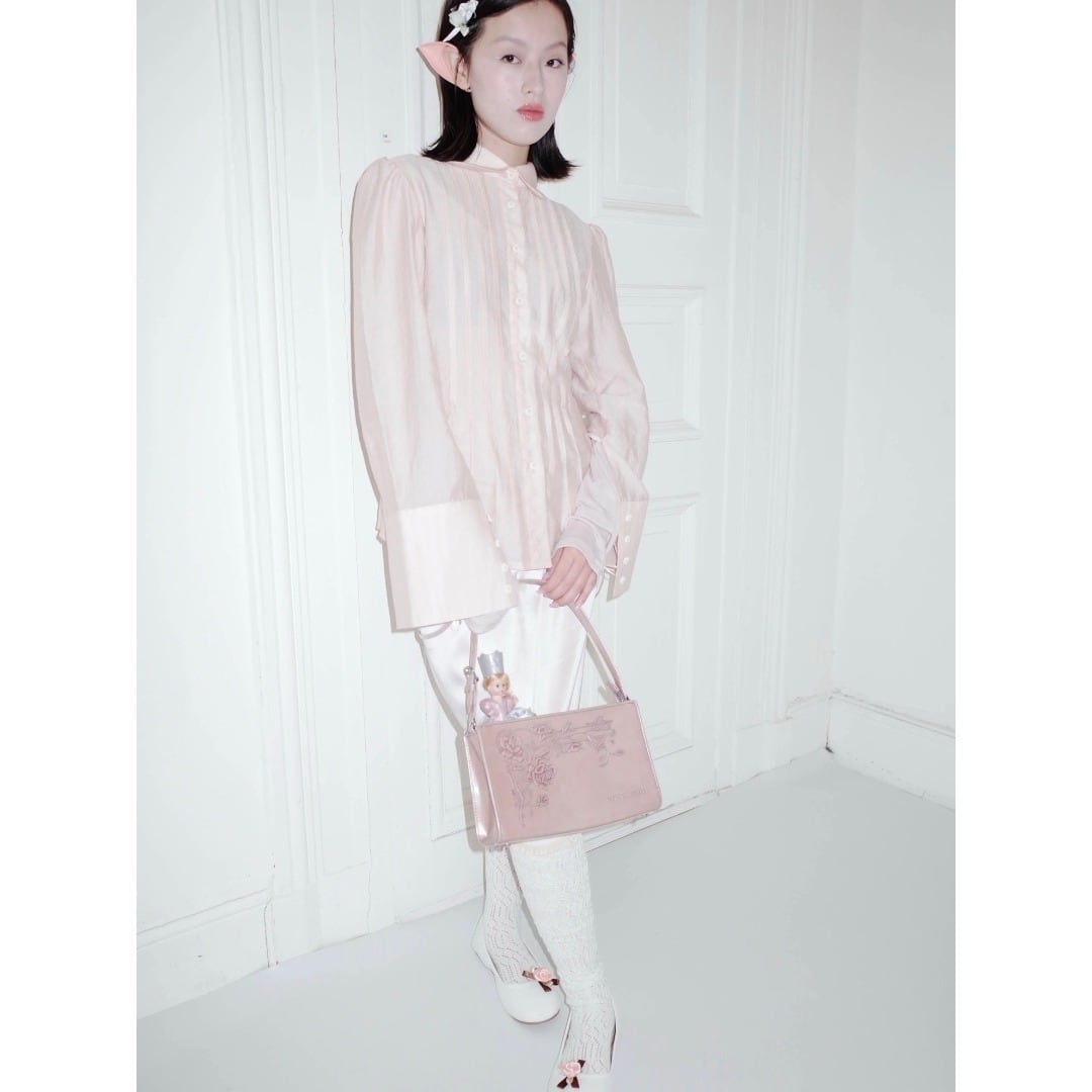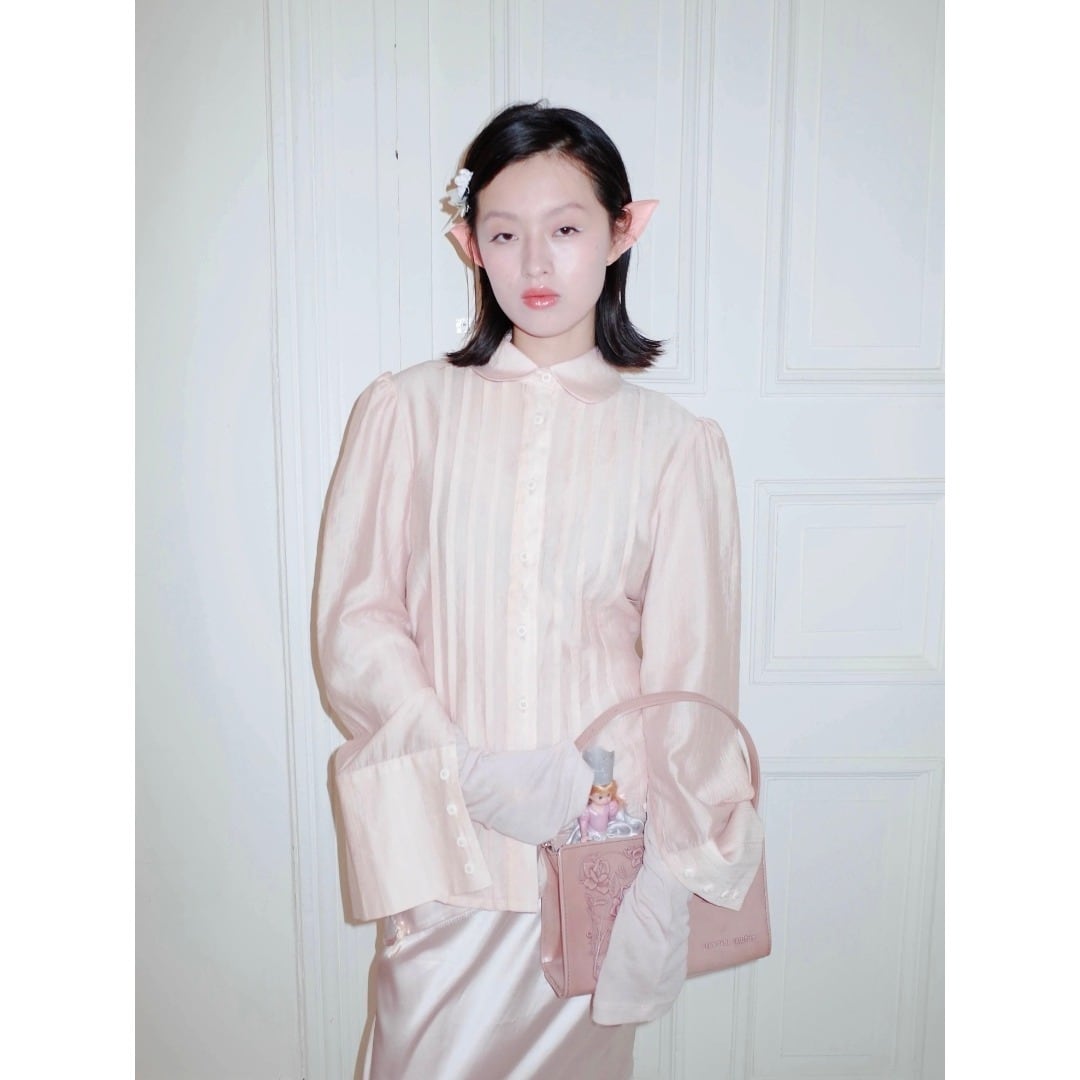 ■Design:フレンチ シアー プリーツ 丸襟 パフスリーブ ロングカフス ブラウス