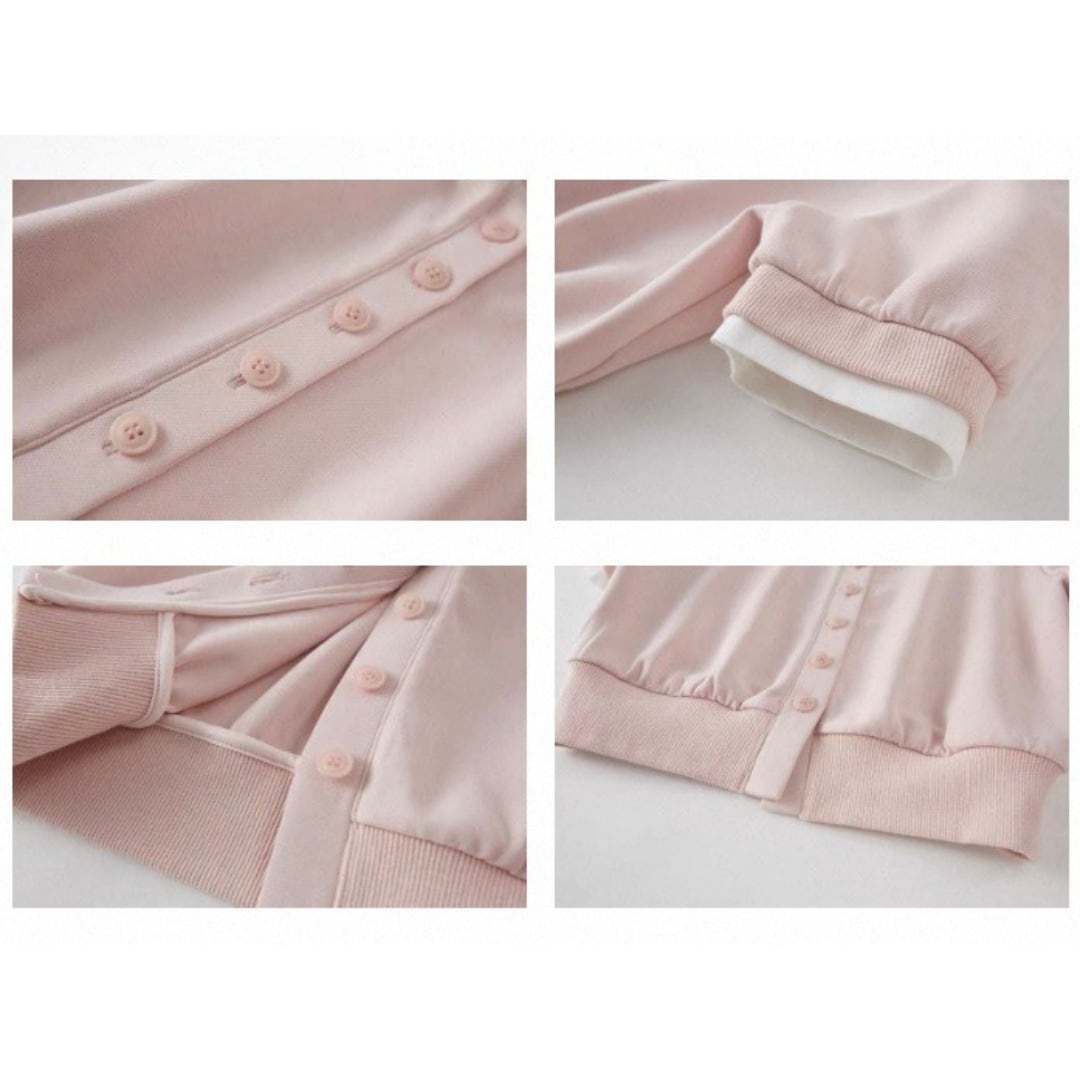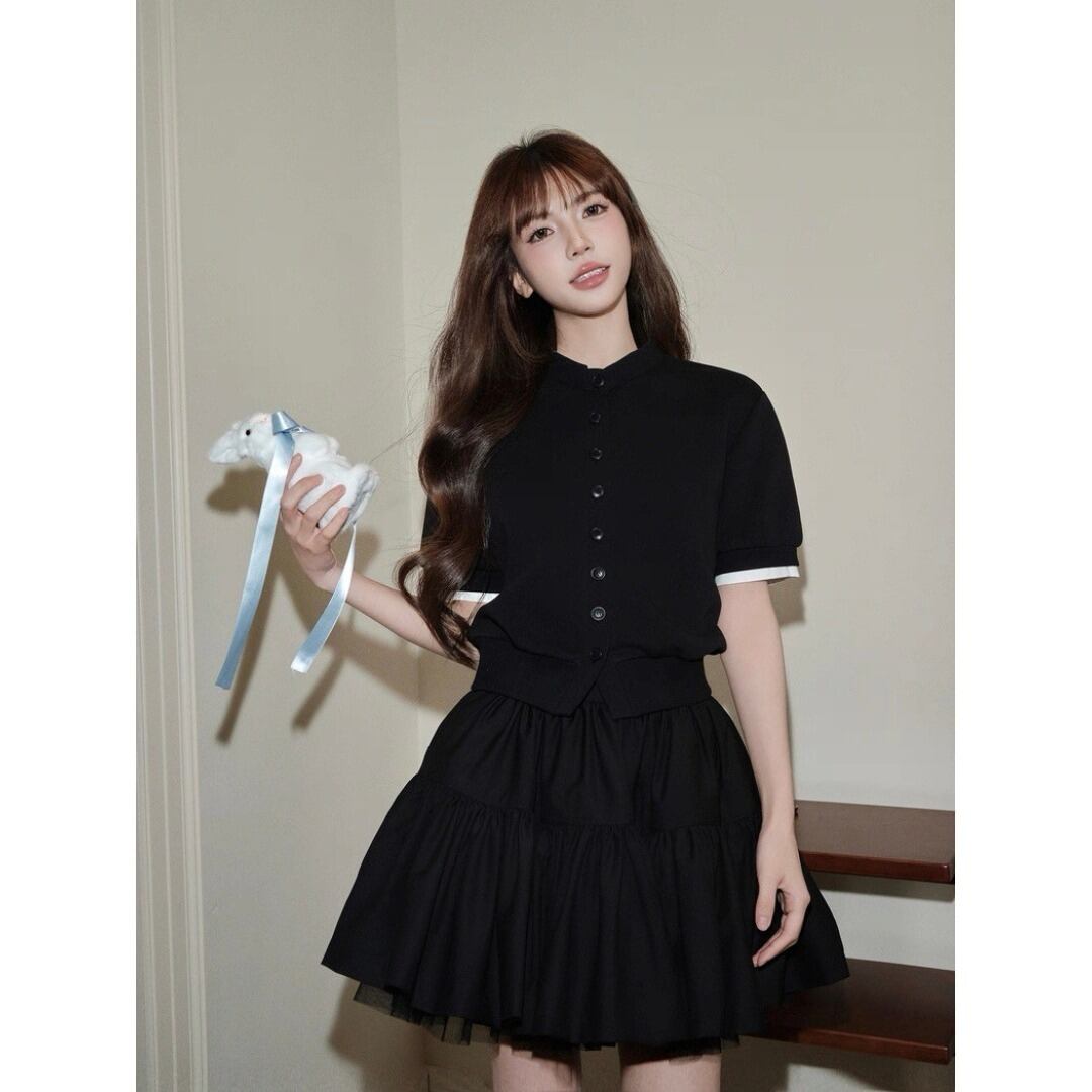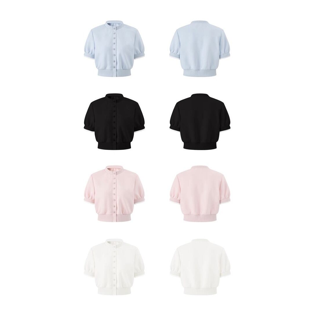 ■Design:フレンチ スタンドカラー フェイクレイヤード 半袖カーディガン ショート丈