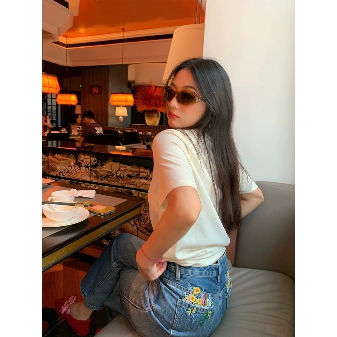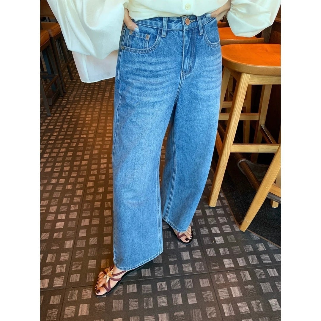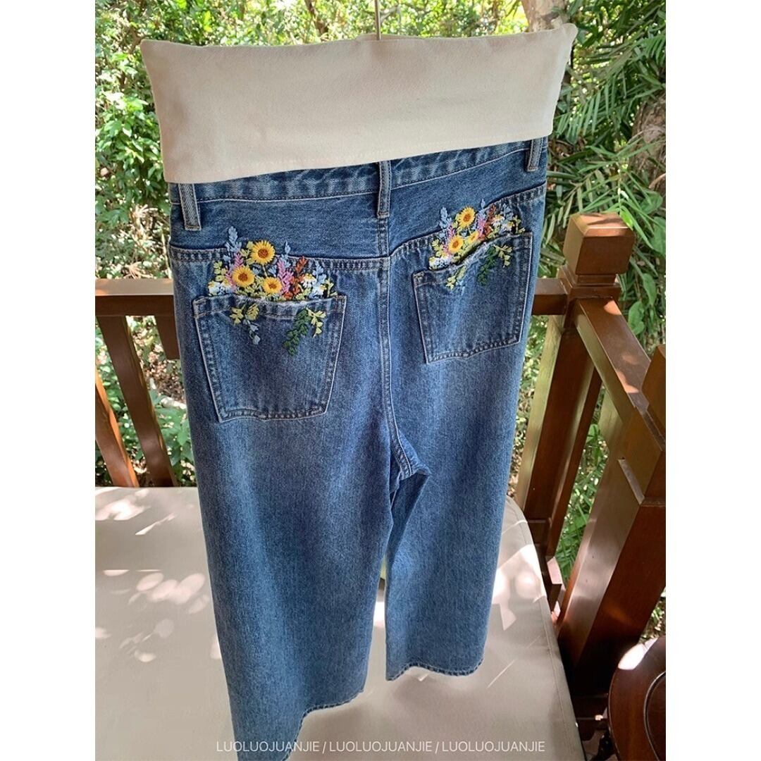 LUOLUOJUANJIE フラワー刺繍 ダメージ ストレートデニム ブルー