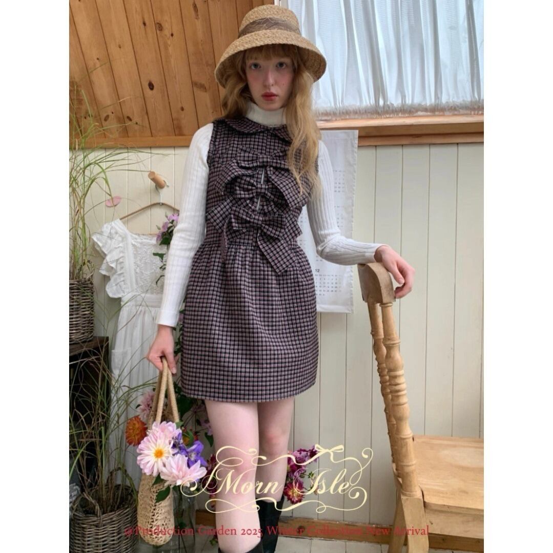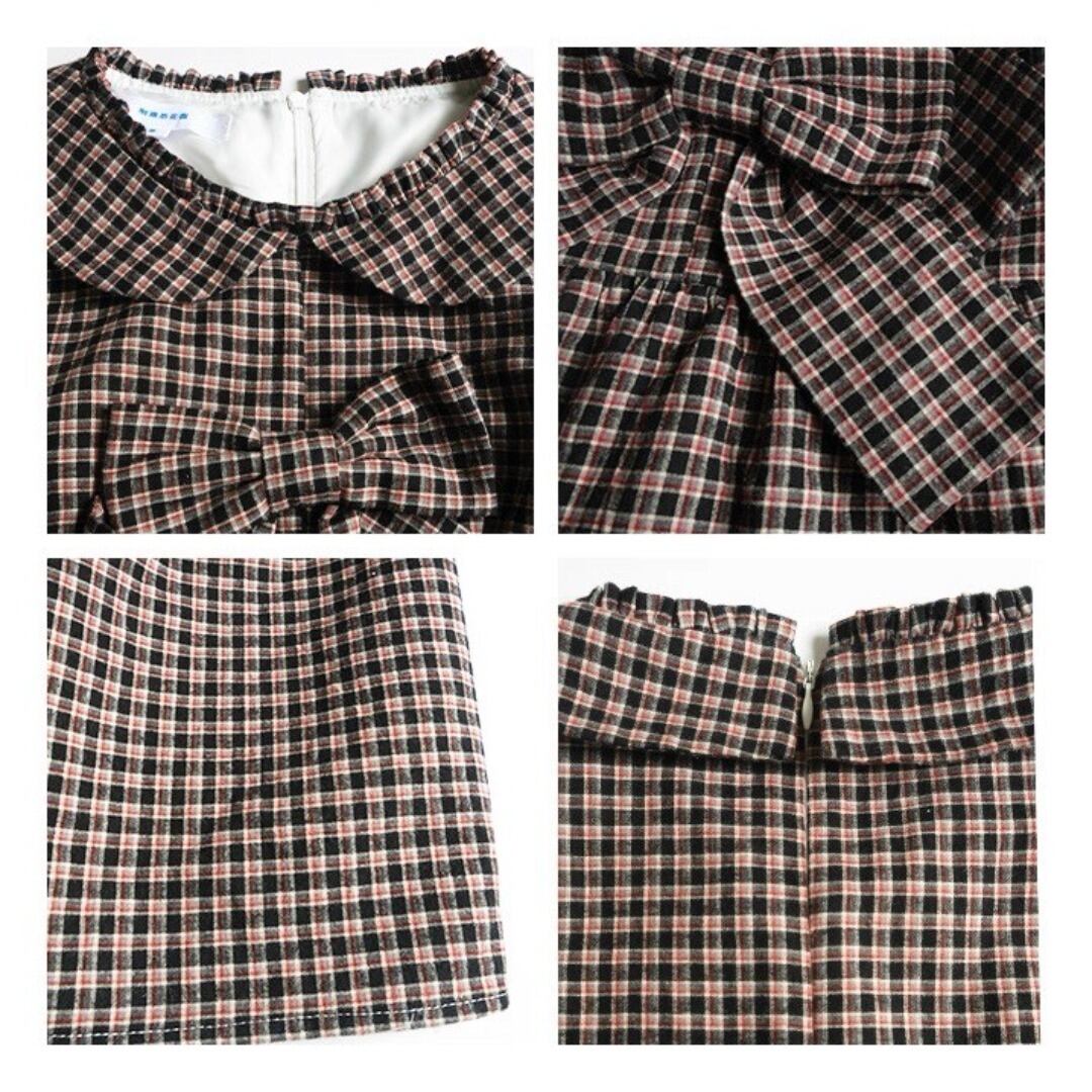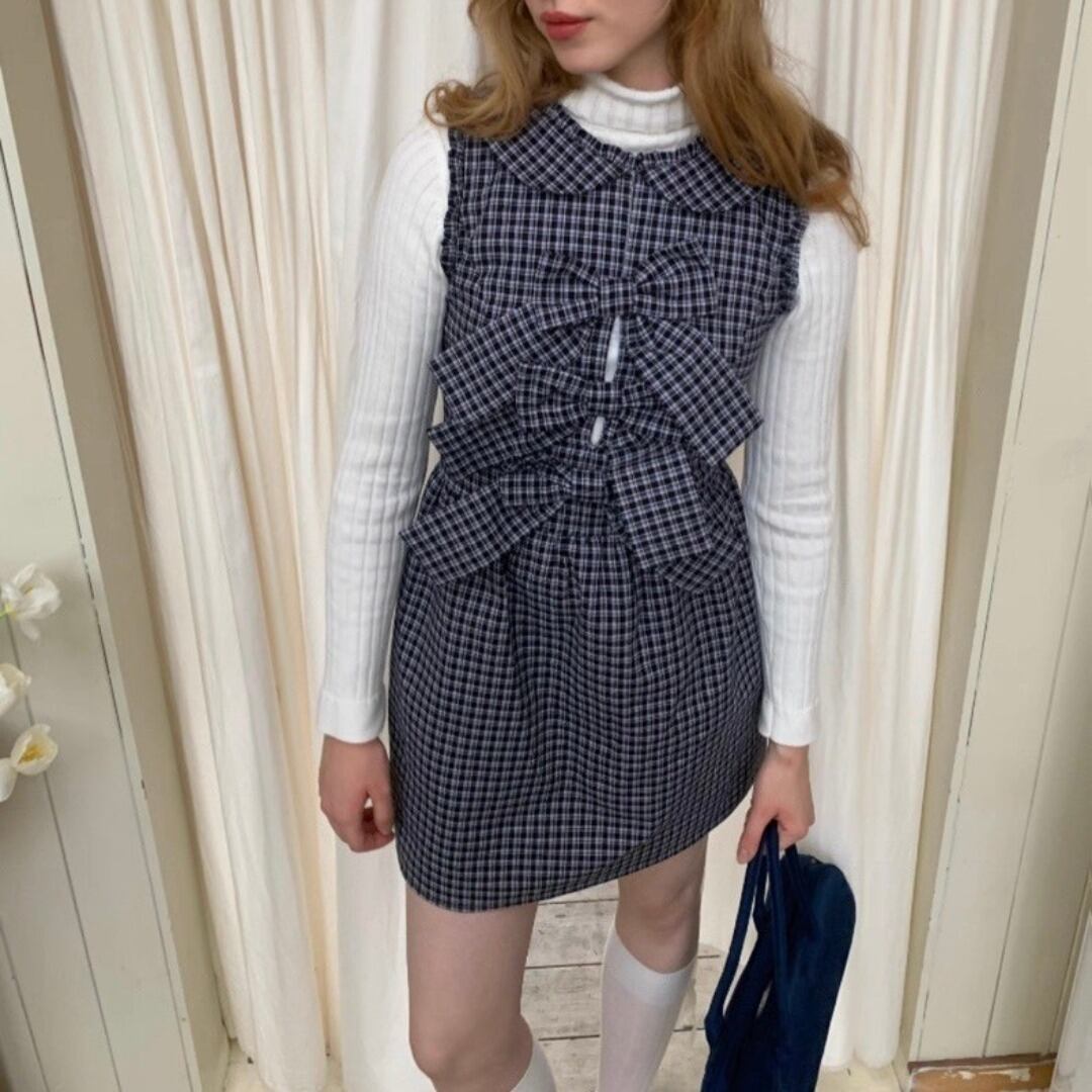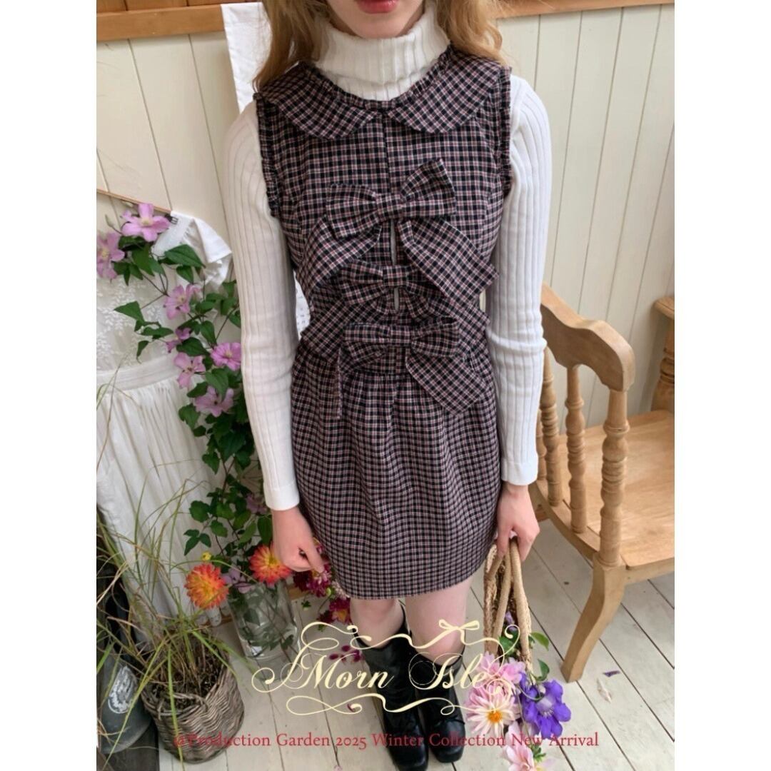 ■Design:ノースリーブ 丸襟 リボン ミニワンピース チェック柄