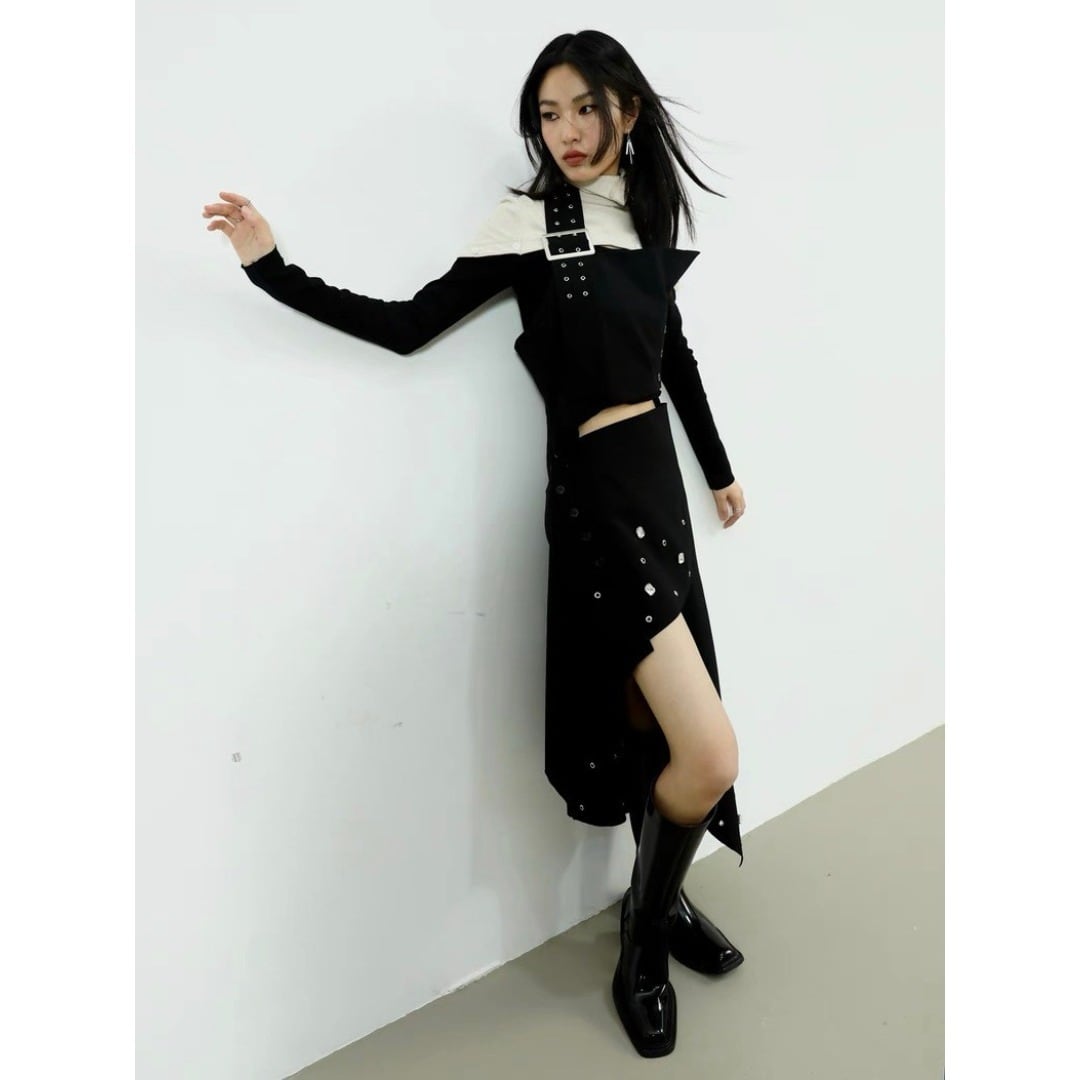■Design:アシンメトリー クリスタル ベルト エプロン ミニワンピース