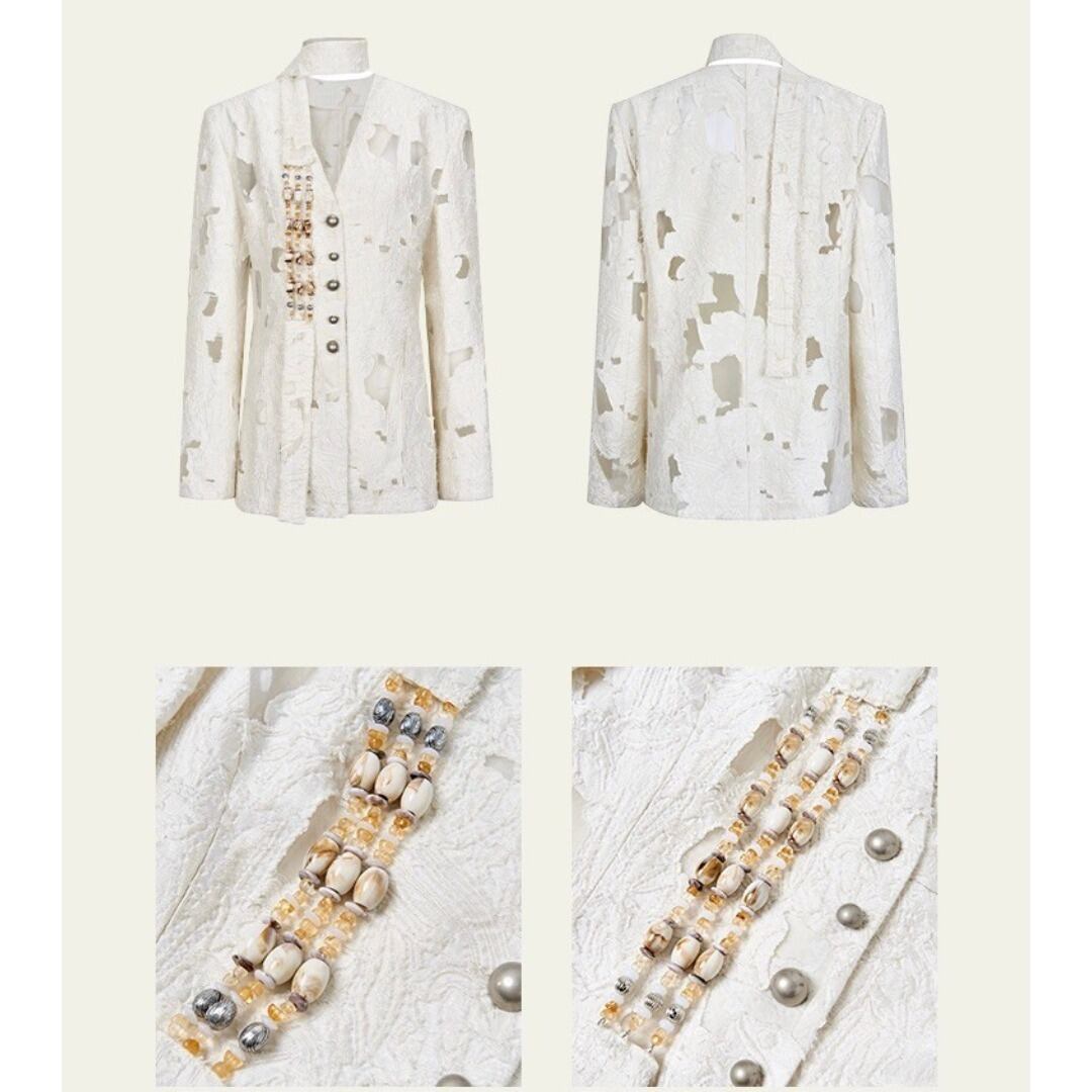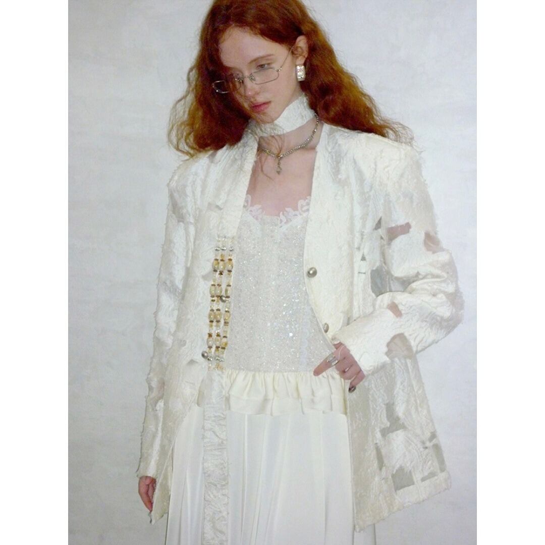 ■Design:ジャガード シアーレース Vネック ノーカラージャケット スカーフ付き