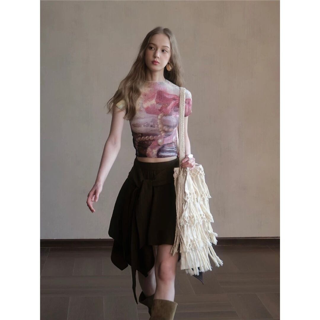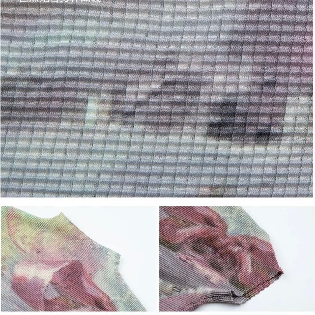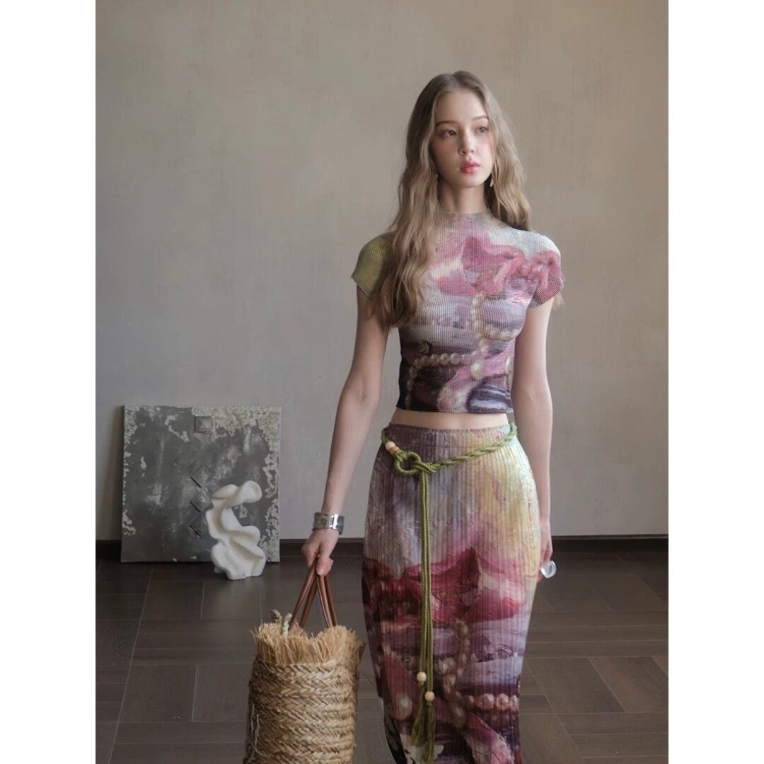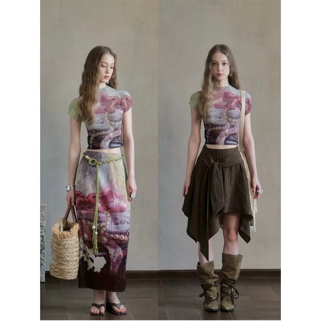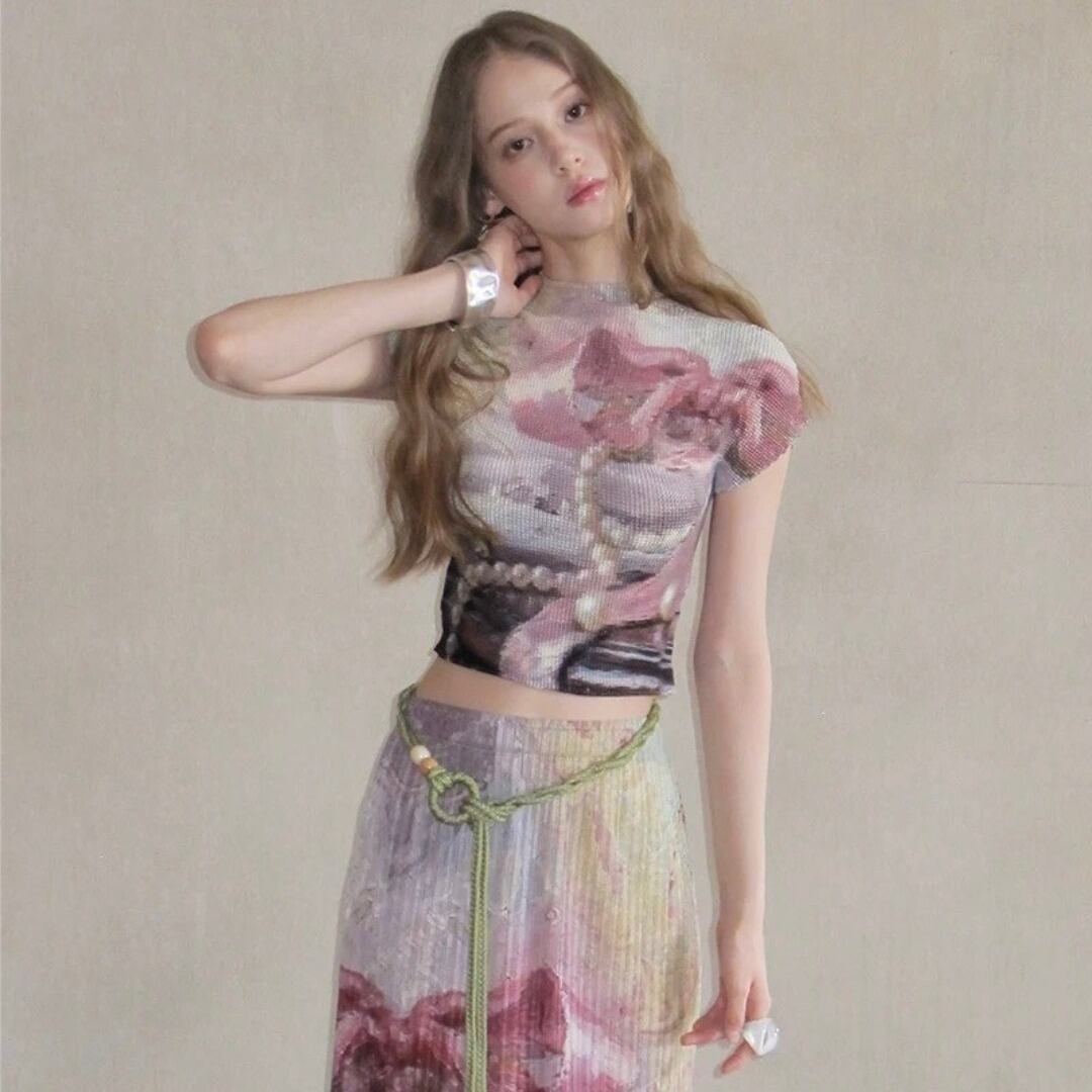 UNSOYAO アート パール 立体プリーツ ストレッチ ショート丈Tシャツ