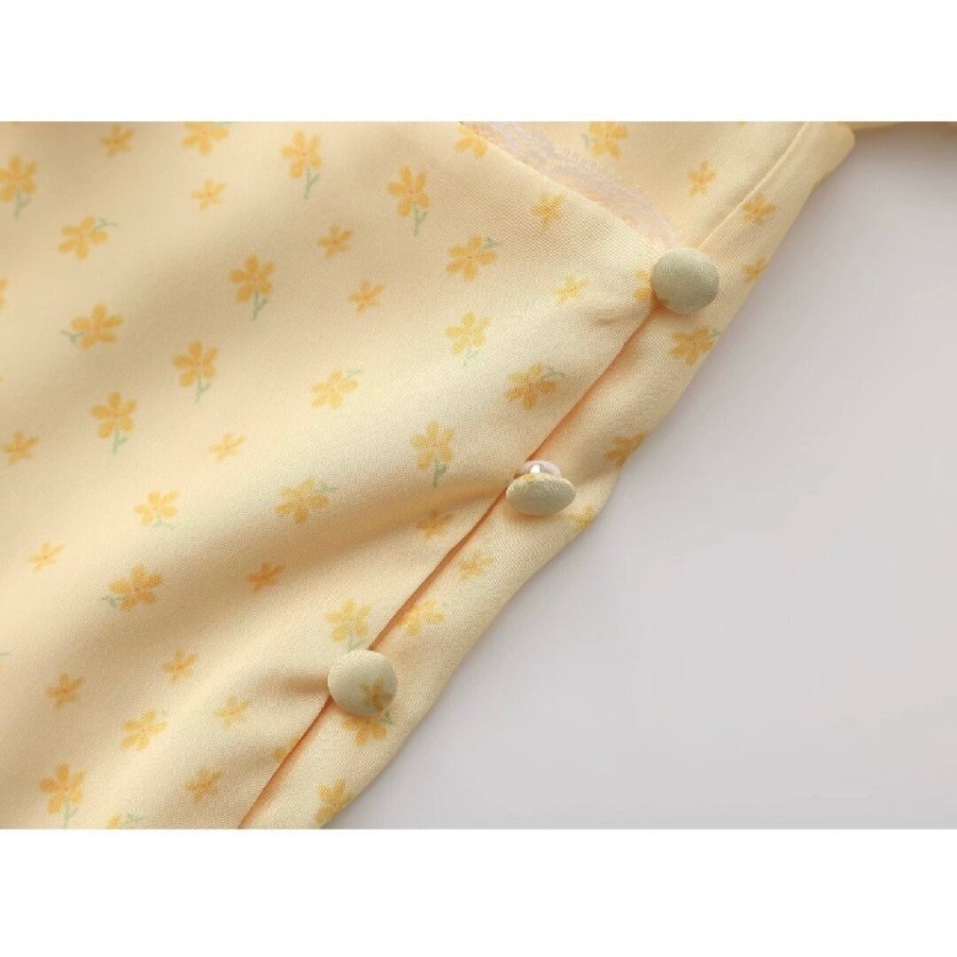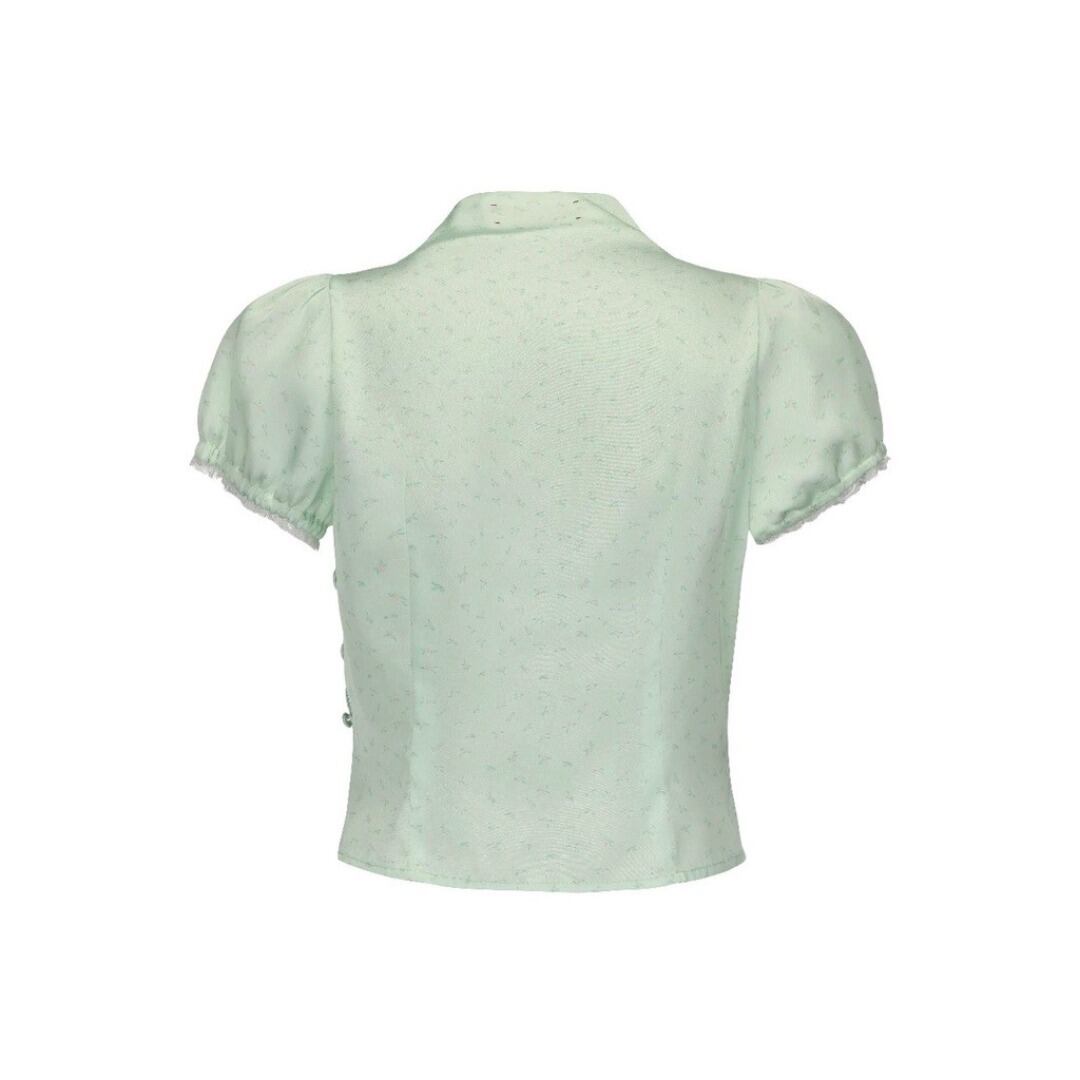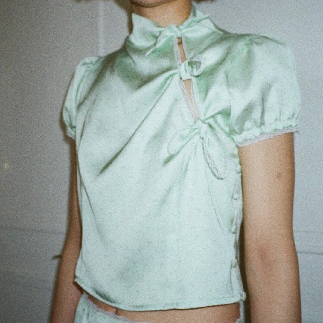 ■Design:プリント パフスリーブ チャイナ ブラウス トップス リボン ショート丈