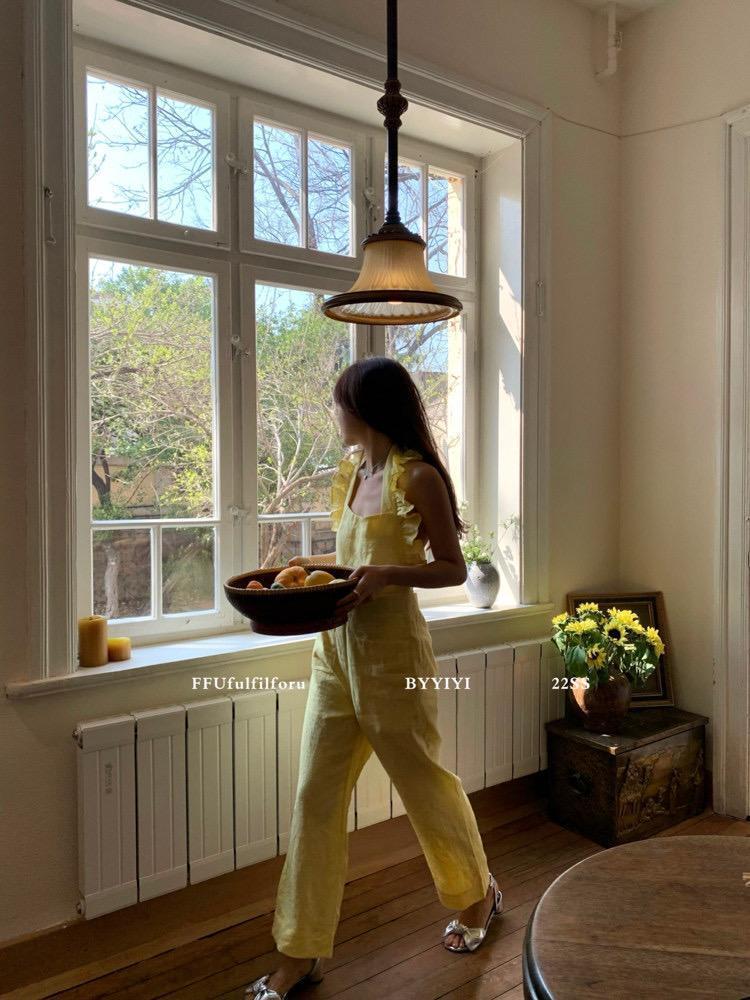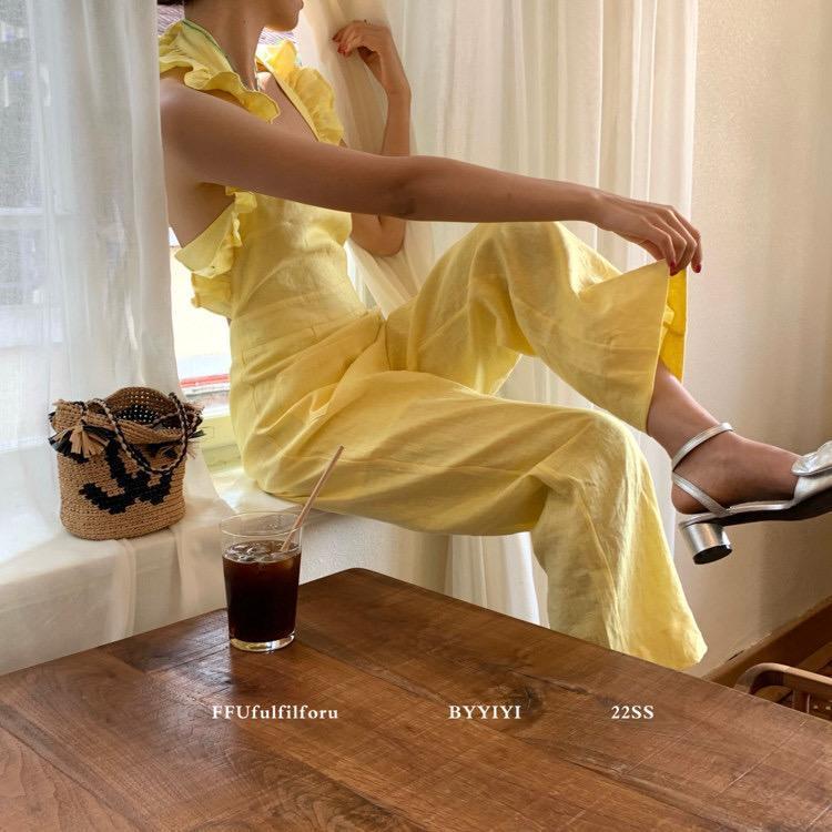 FulfilForU Linen Yellow Ruffle Overalls Straight Yellow