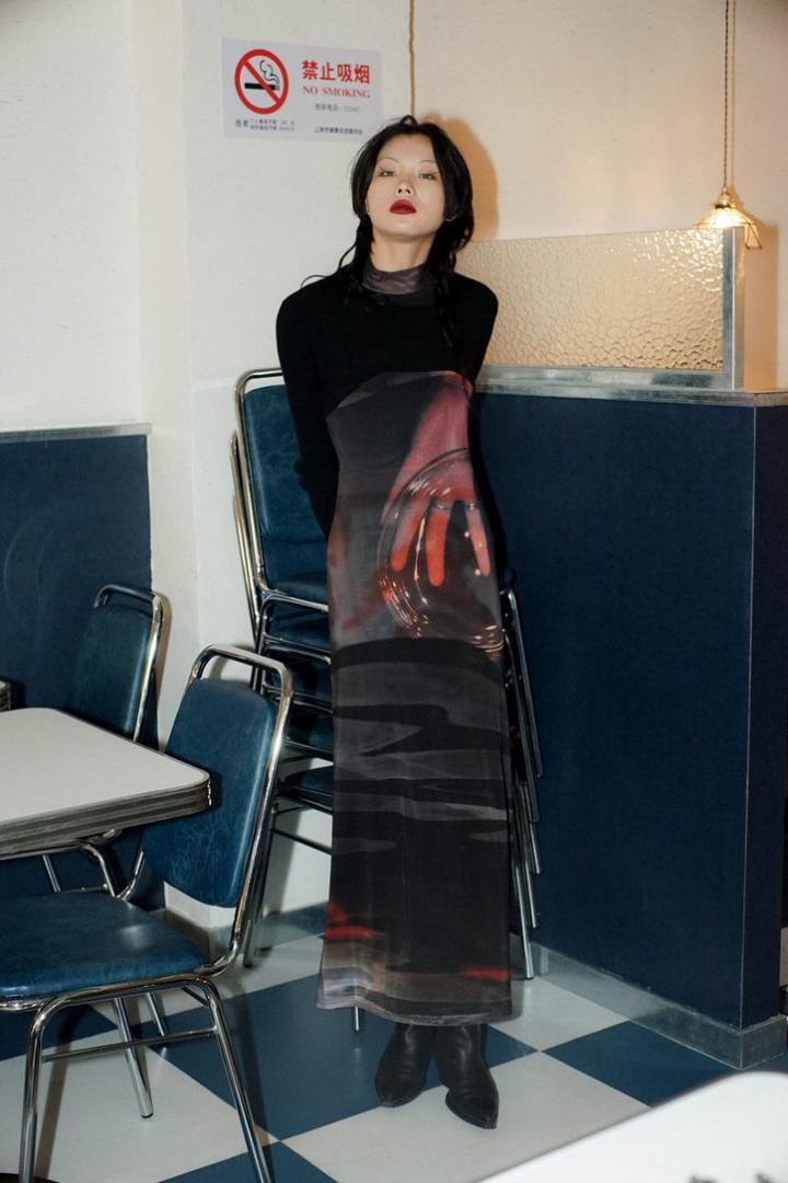 ブラウン〜ブラックのグラデーションカラーにレッドの配色が美しく、アートプリントが印象的な一点。