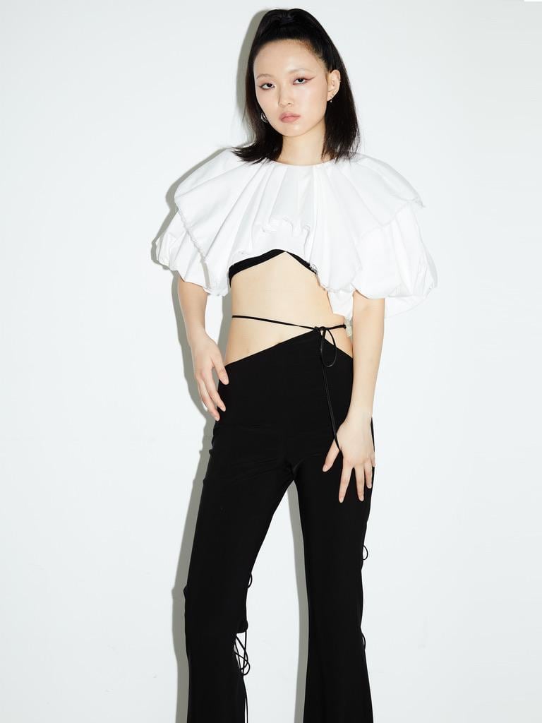 ホワイトのガーリーな雰囲気に、超ショート丈のモードな雰囲気でバランスの良いデザインです。