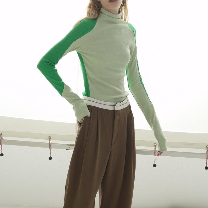 同系色のツートーンが混じったデザインがシンプルながらアクセントになる一点。