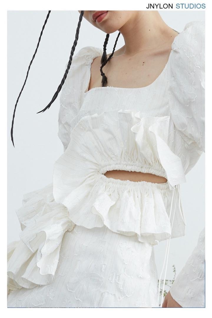 パフスリーブや大きなフリルの飾りがガーリーで可愛らしい印象の一点。