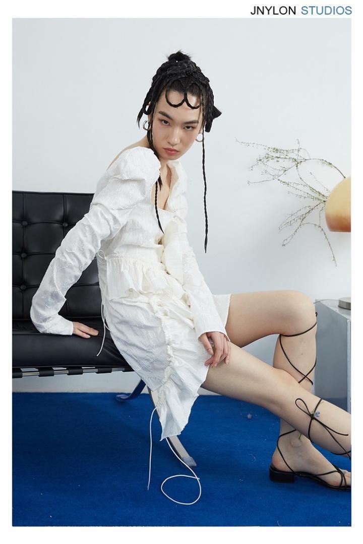 アシンメトリーなサイドのデザインや、ウエストのカットがモードな雰囲気をプラス。