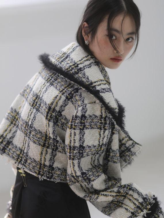 縁についたファーや、柔らかなホワイト地のチェック柄が甘めの印象に。