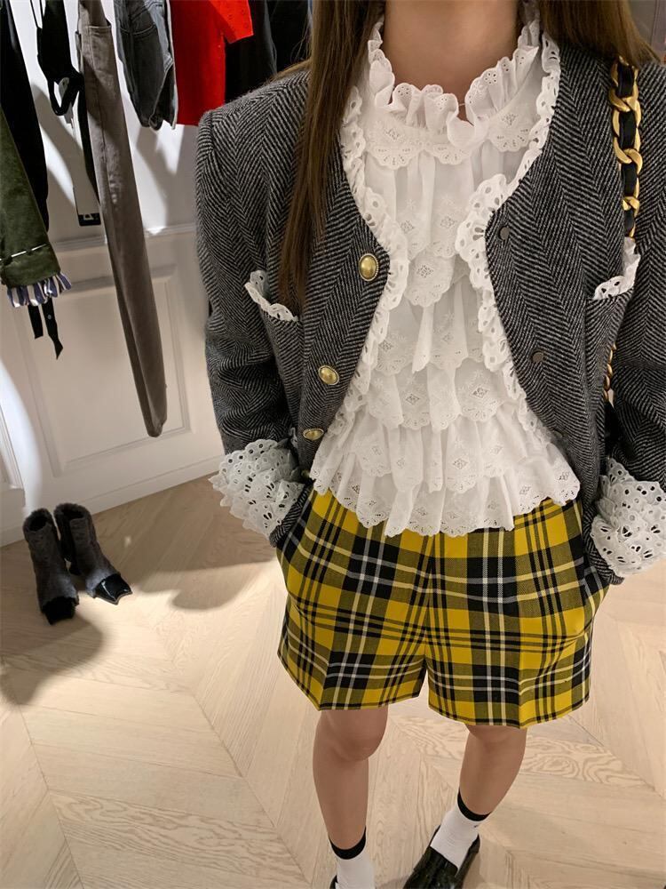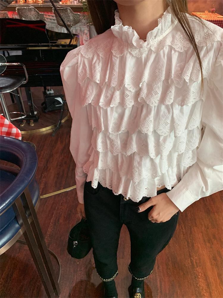 LUOLUOJUANJIE Classical tiered ruffle cotton blouse white