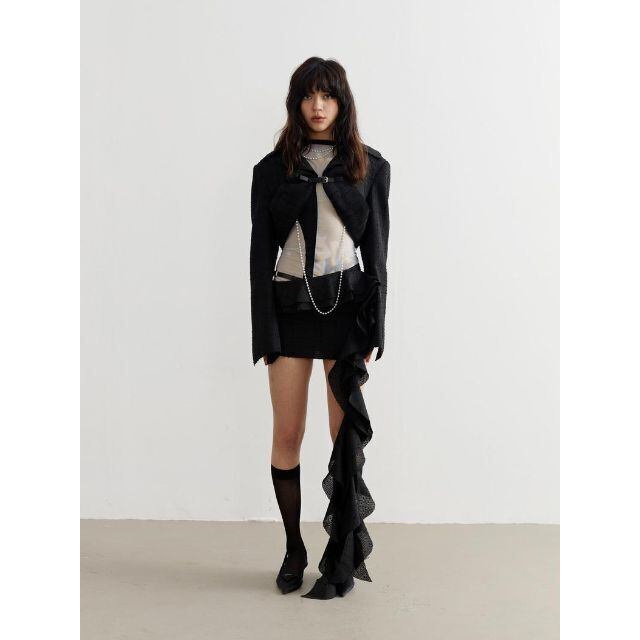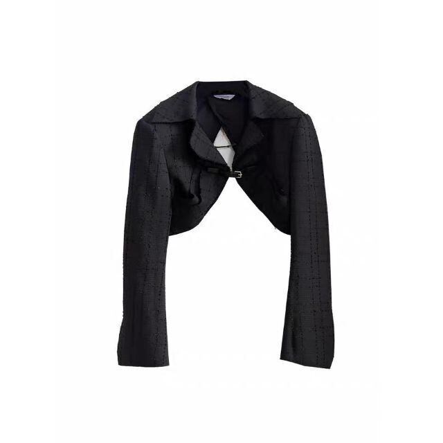 ボレロのようなショートな丈感や、バックが開いたデザインが個性的で印象的な一点。