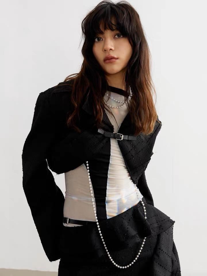 伸縮性のある生地で、体に沿うコンパクトなシルエット。