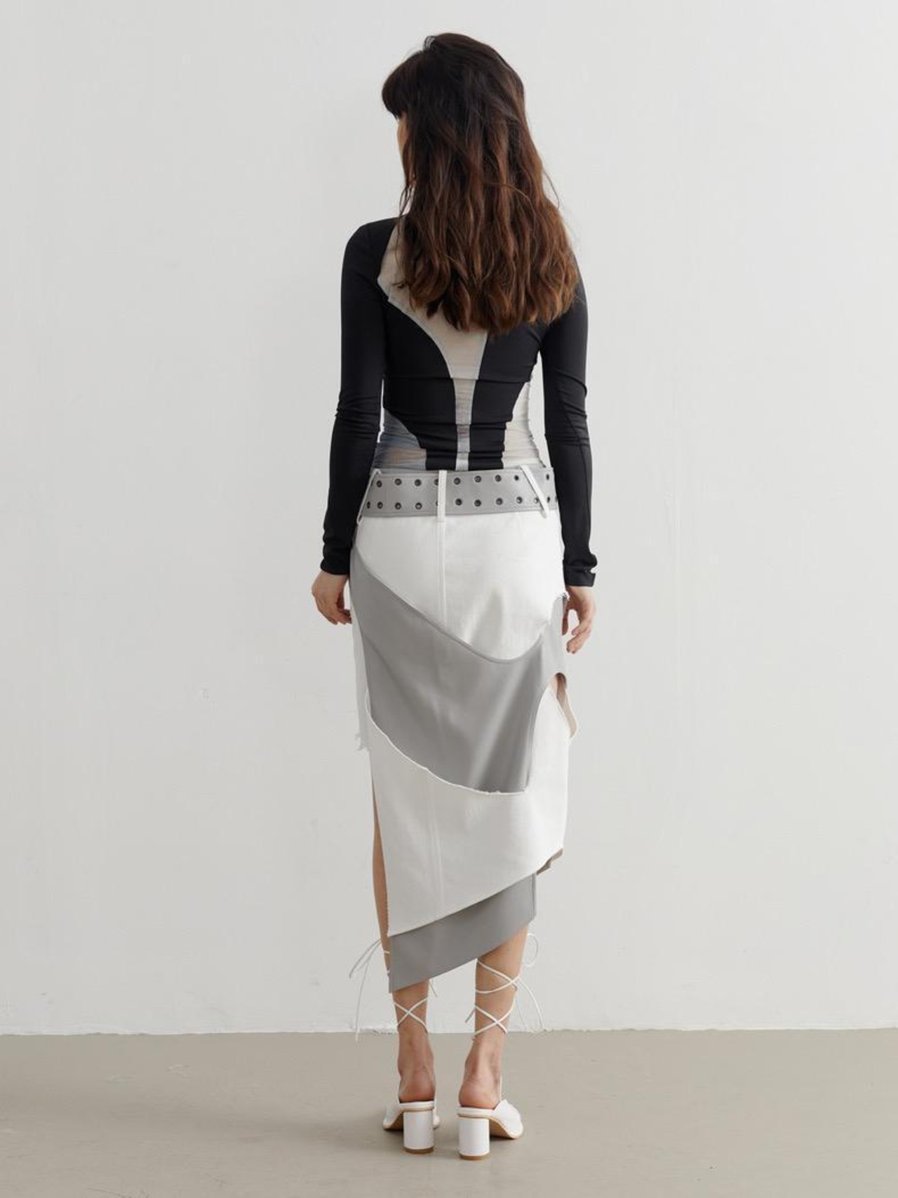 アシンメトリーな柄にツートーンの配色がインパクト大の一点。