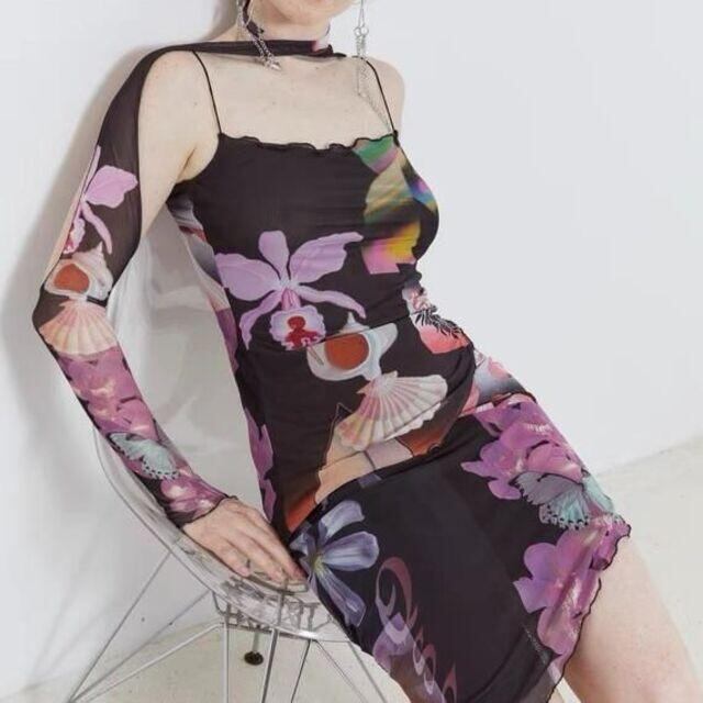 シアーなブラックにピンクのお花や貝殻、蝶々などの柄が個性的で素敵な一点。首に巻いて使用するデザインでチョーカーのような印象にも。
