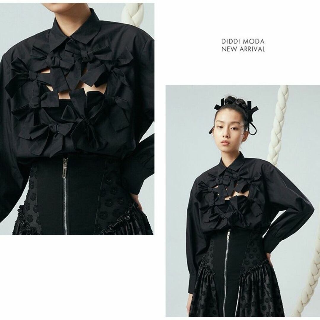 DIDDI MODA Black Cutout Ribbon Long Shirt Blouse