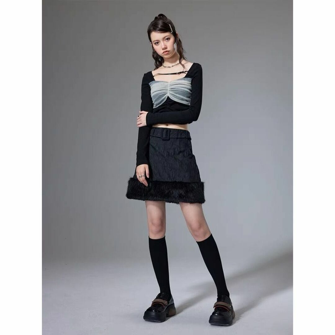 DIDDI MODA Black jacquard fur trapezoid miniskirt belt